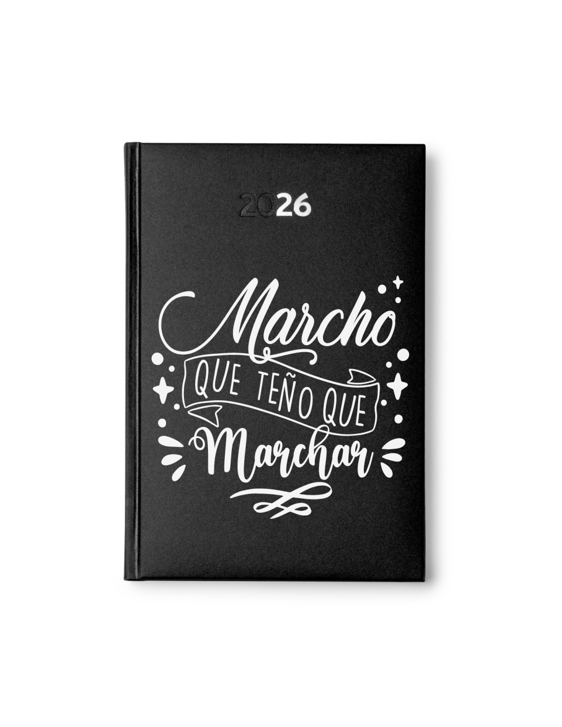 Original agenda 2026 a página día, decorada con el mensaje "marcho que teño que marchar".