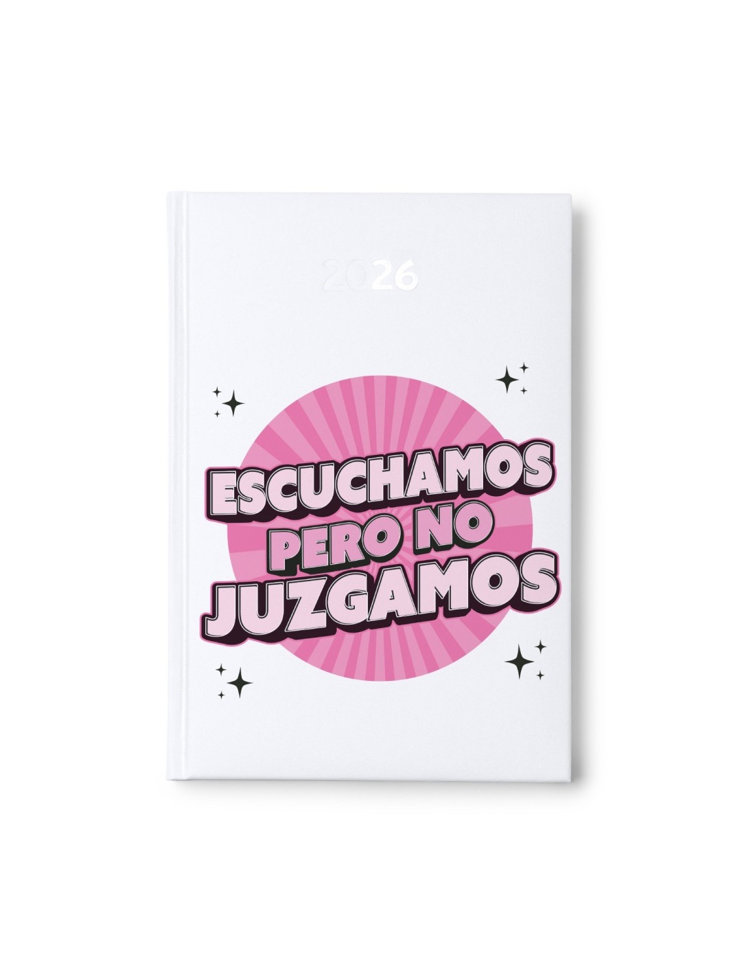 Original agenda 2026 a página día, decorada con el mensaje "escuchamos pero no juzgamos".
