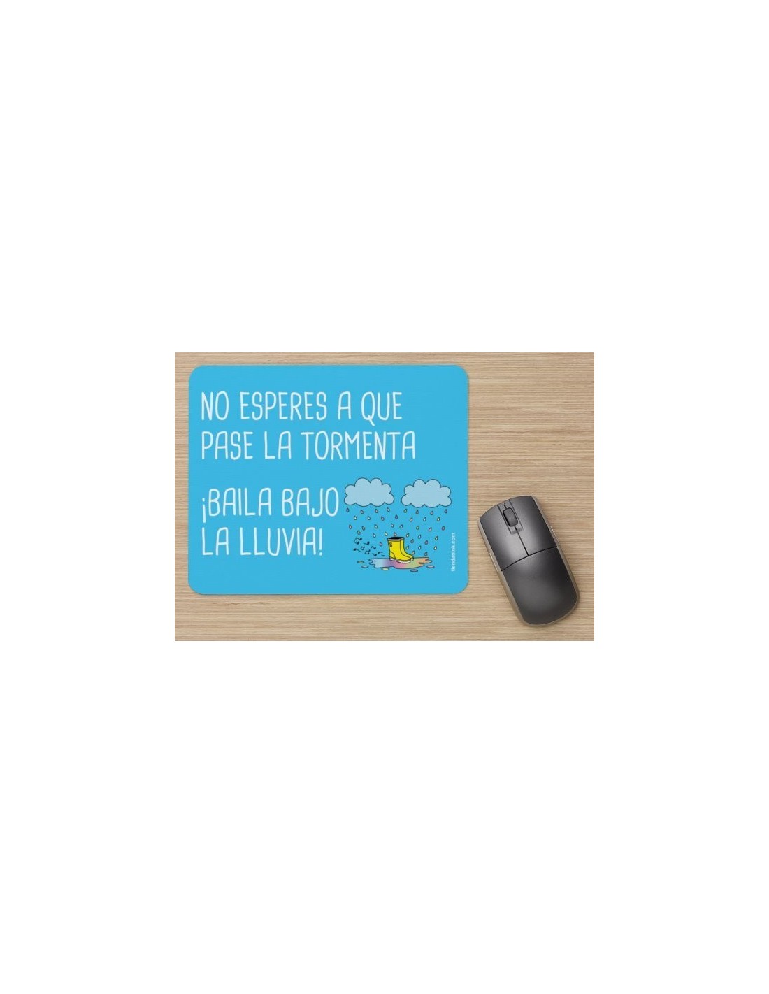 Original alfombrilla azul para ratón de ordenador decorada con el mensaje "no esperes a que pase la tormenta ¡baila bajo la lluvia!".