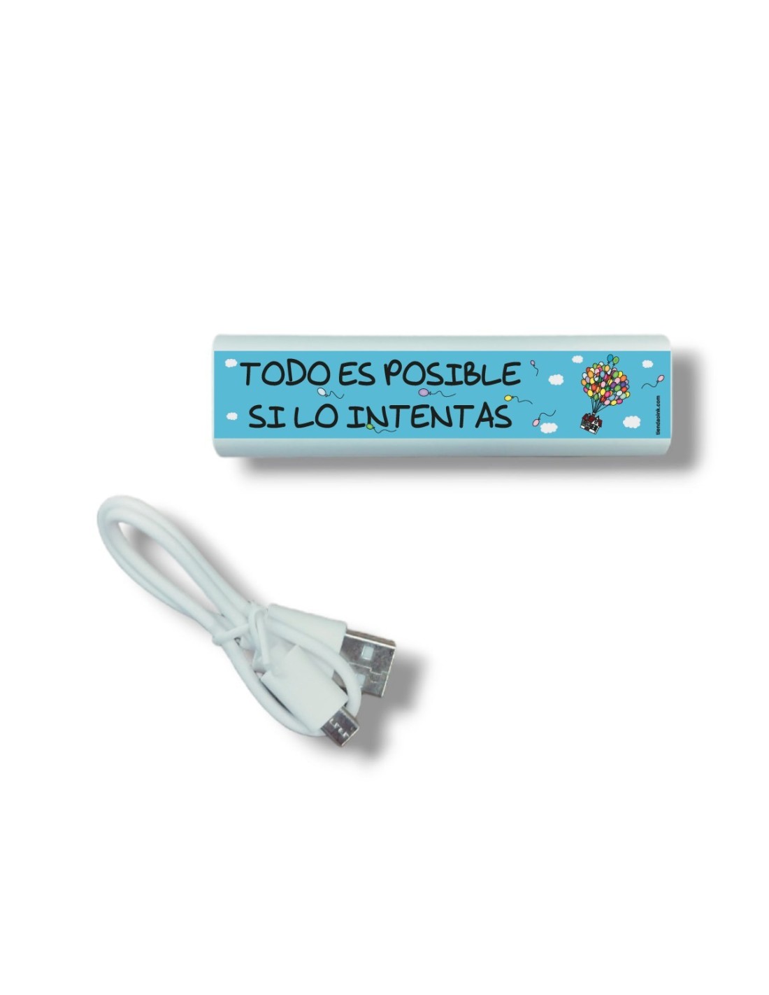 Power bank con mensaje "Todo es posible si lo intentas" para cargar tus dispositivos en cualquier lugar.
