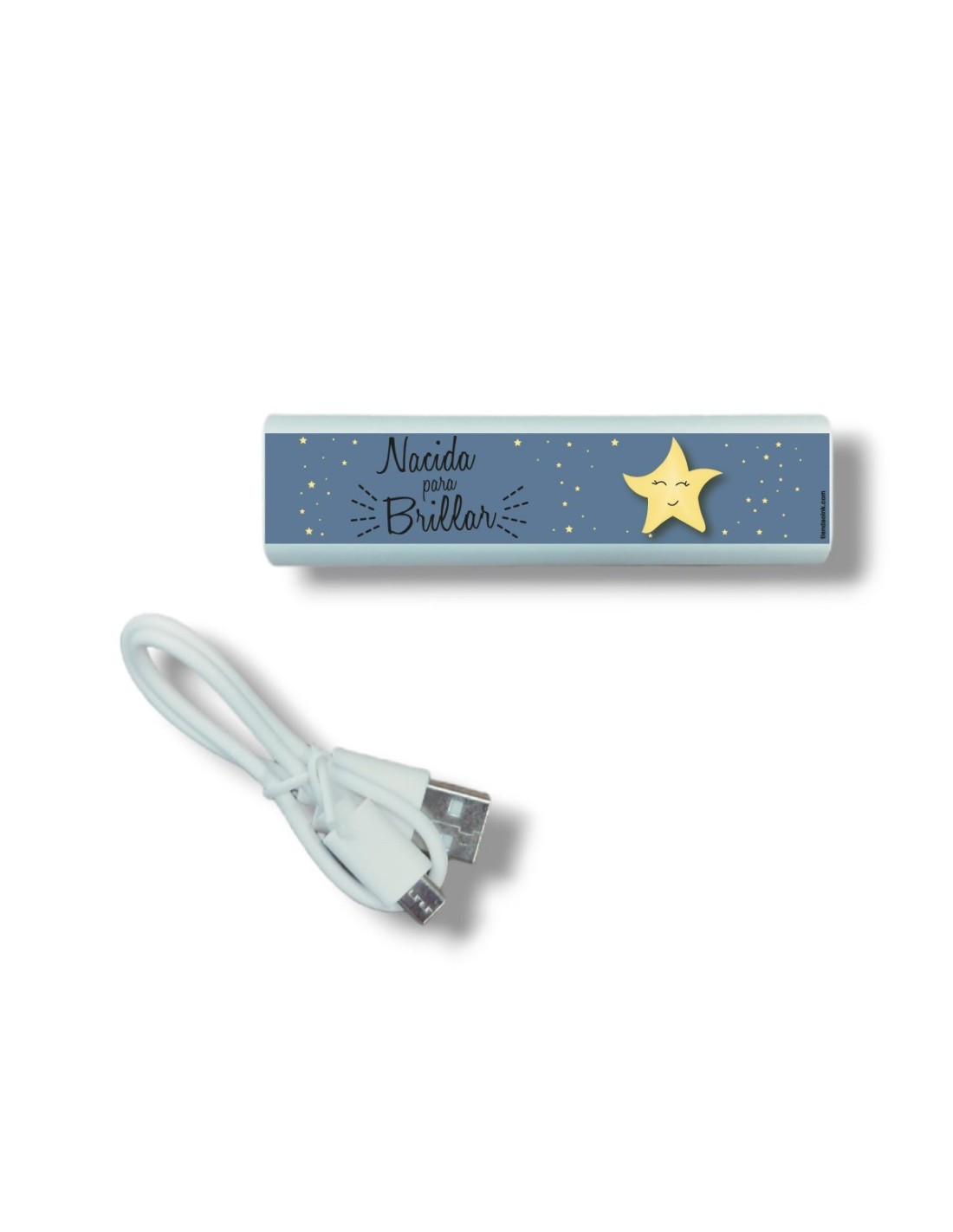 Power bank con mensaje "Nacida para brillar" para cargar tus dispositivos con rapidez en cualquier lugar.