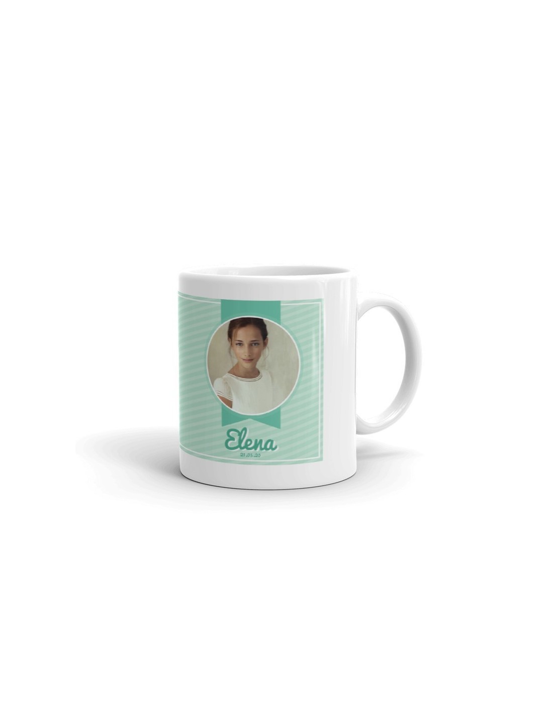 Original taza personalizada con foto decorada con temática de primera comunión para niña en tonos verdes.