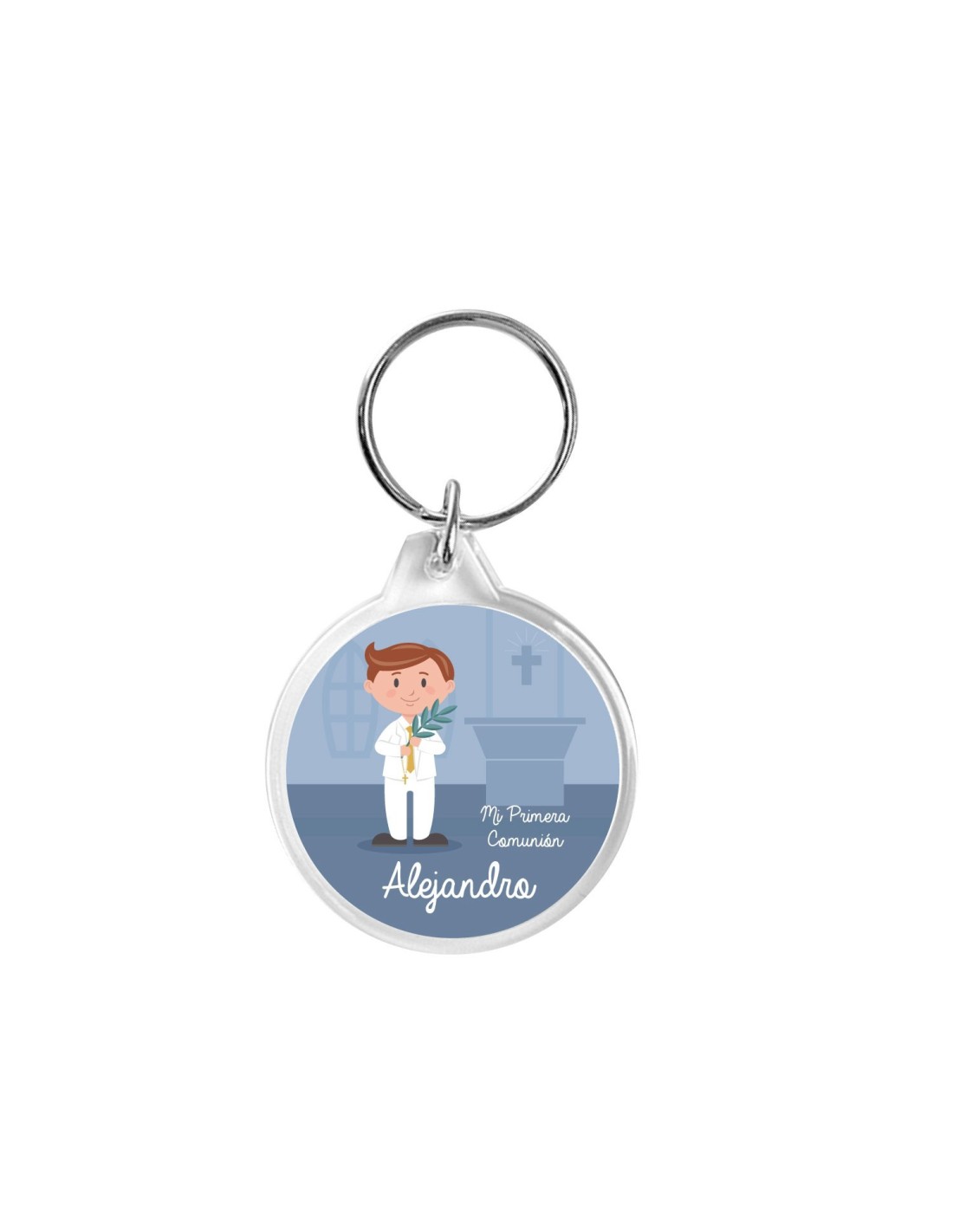 Original llavero personalizado para comunión con el dibujo de un niño de comunión en la iglesia.