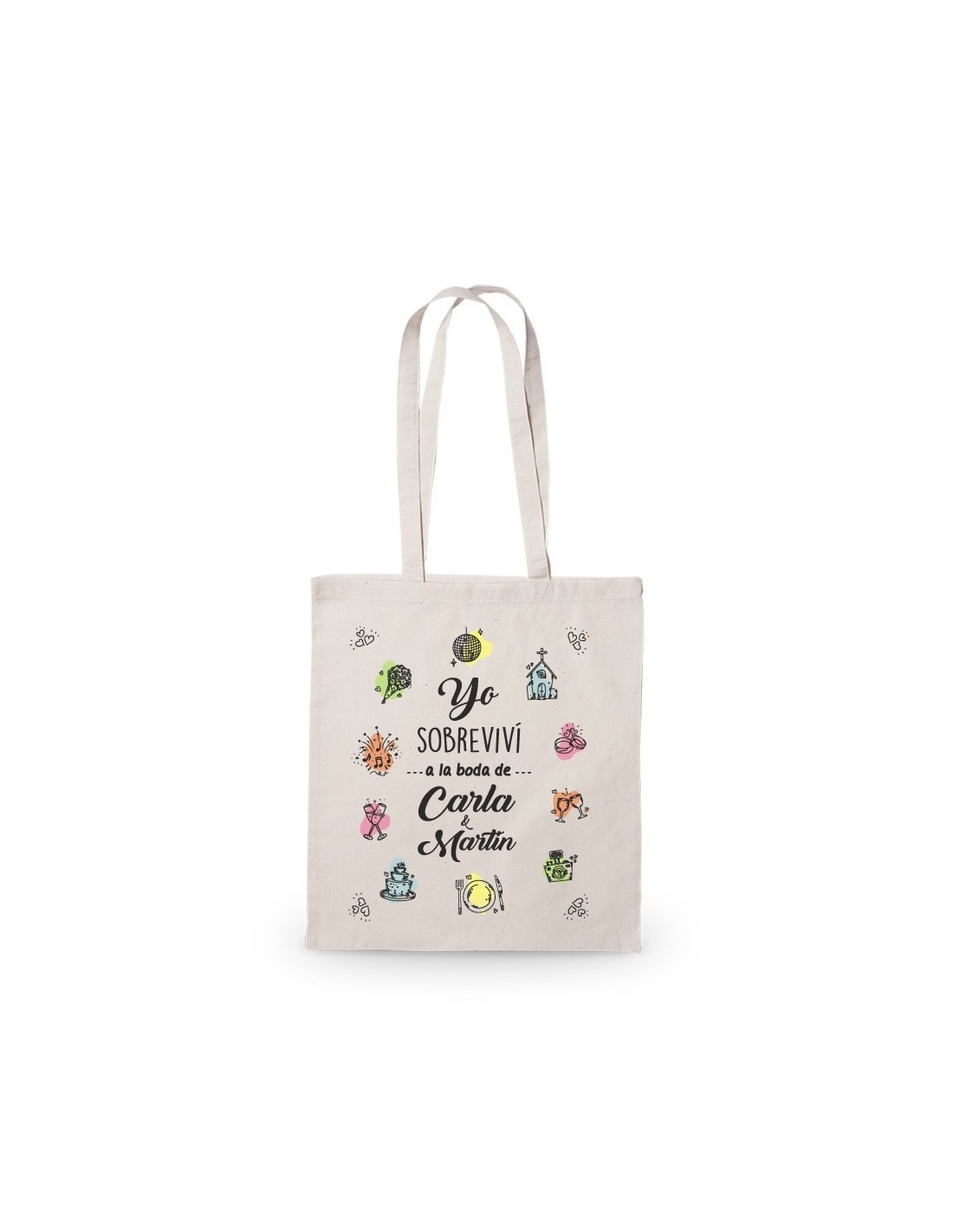 "Original bolsa personalizada para boda con el mensaje "Yo sobreviví a la boda de...."