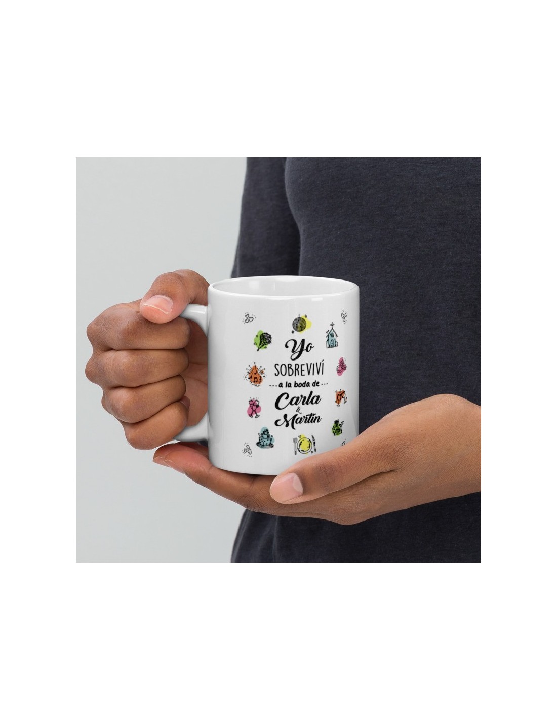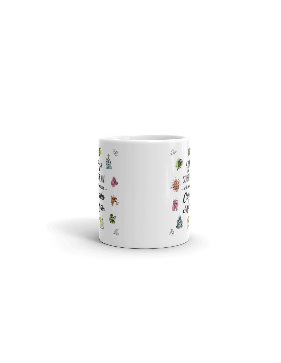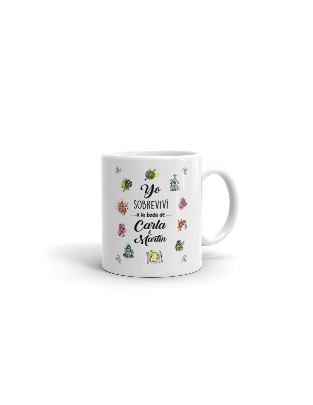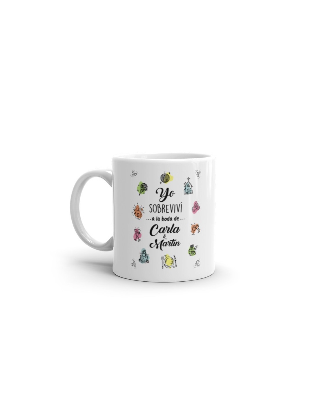 Original taza personalizada para boda con el el texto "Yo sobreviví a la boda de...."