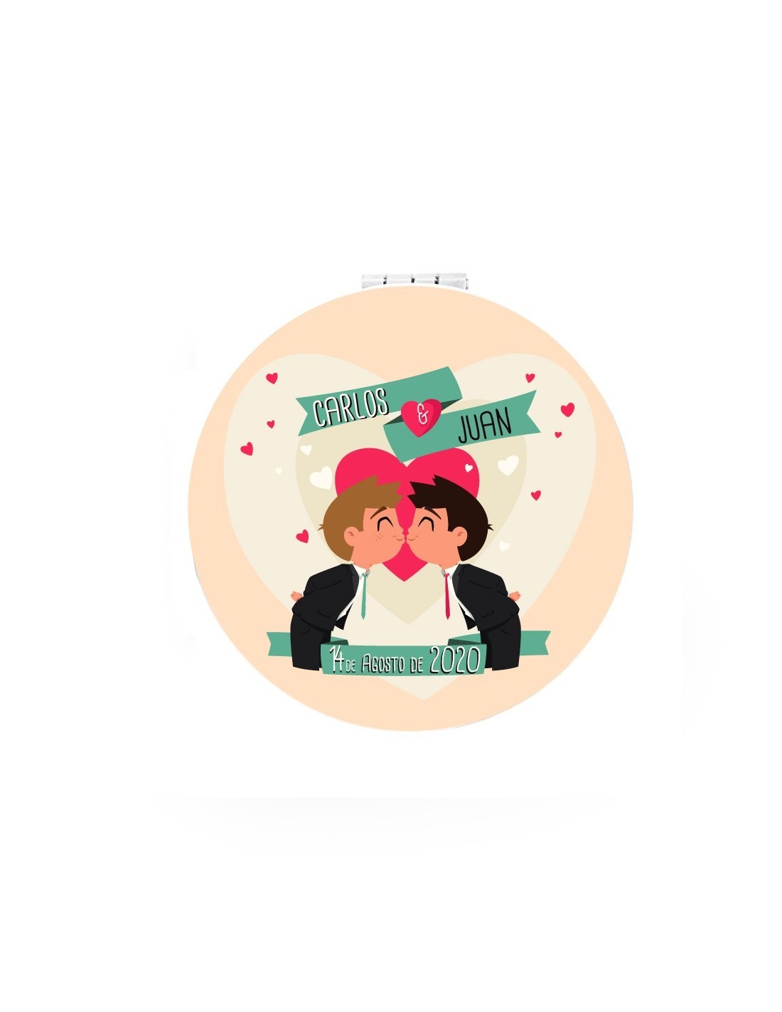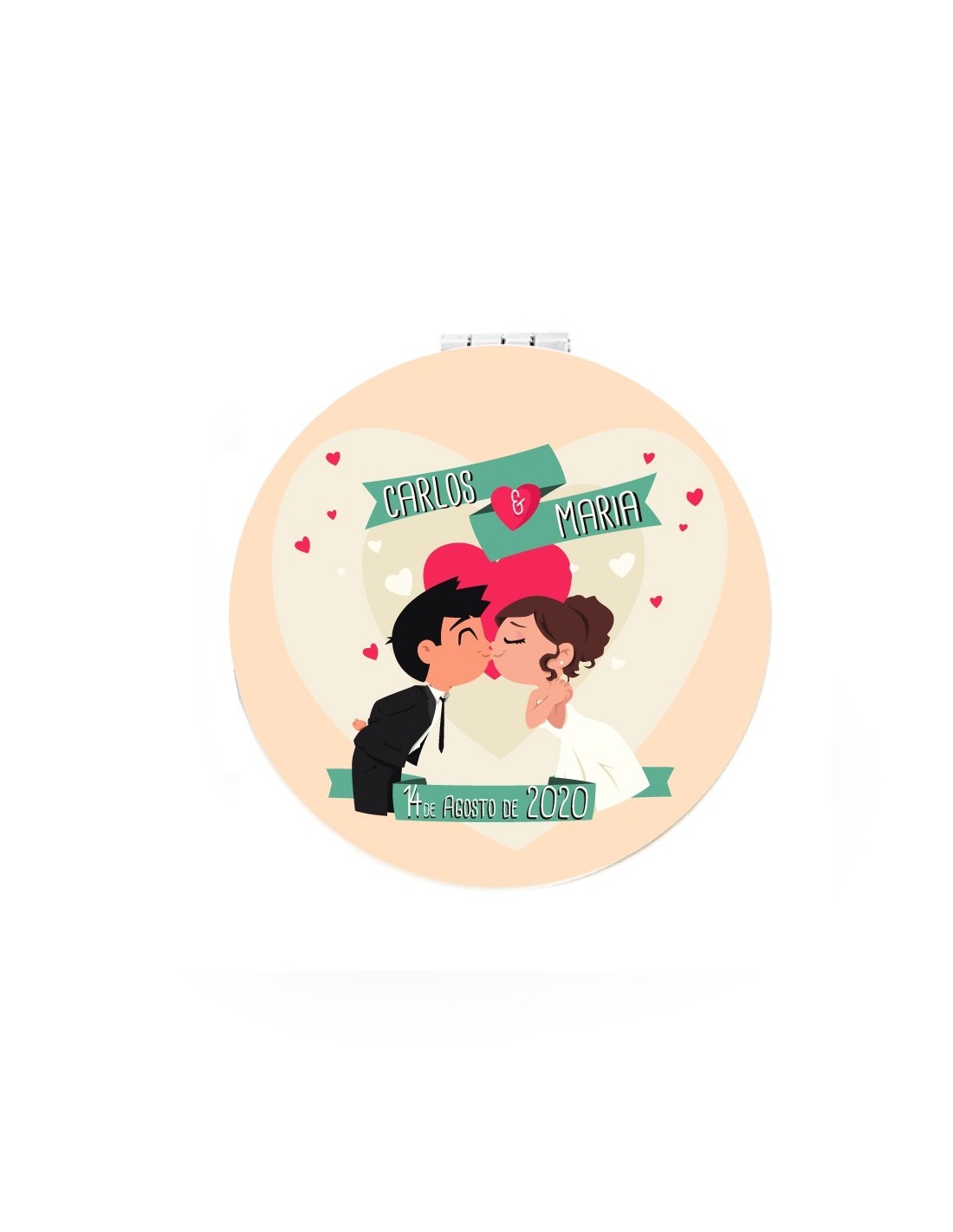 Original espejo de bolso con aumento para boda decorado con unos simpáticos novios besándose.