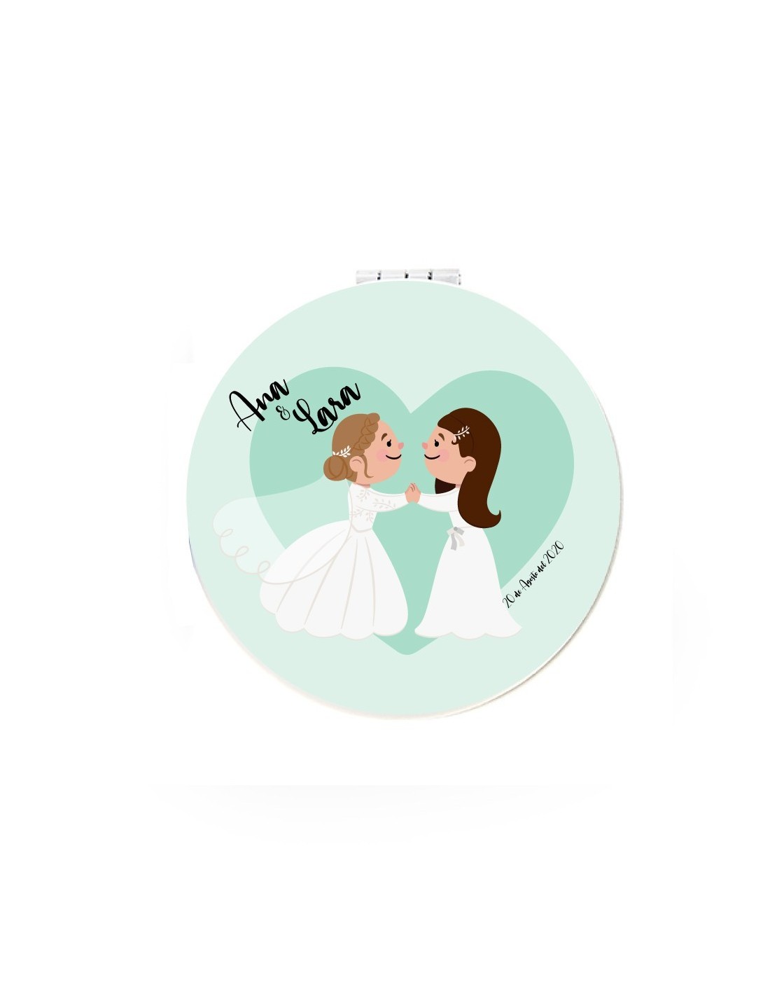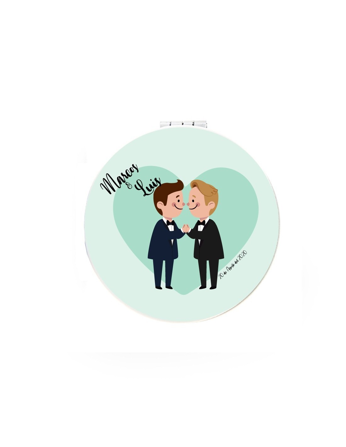 Original espejo de bolso con aumento para boda decorado con unos simpáticos novios mirándose.