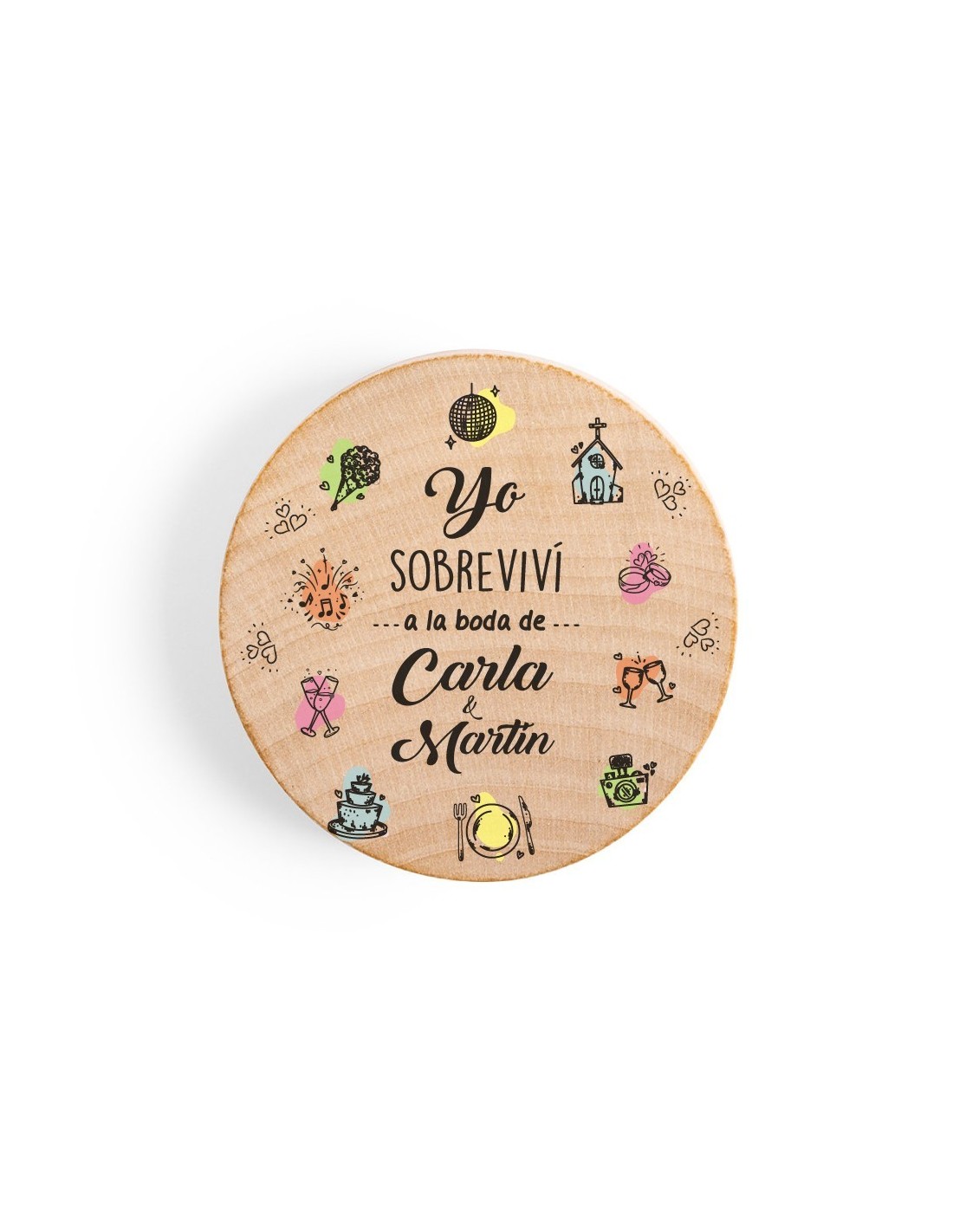 Original abridor de madera con imán personalizado para boda decorada con el texto "Yo sobreviví a la boda de....."
