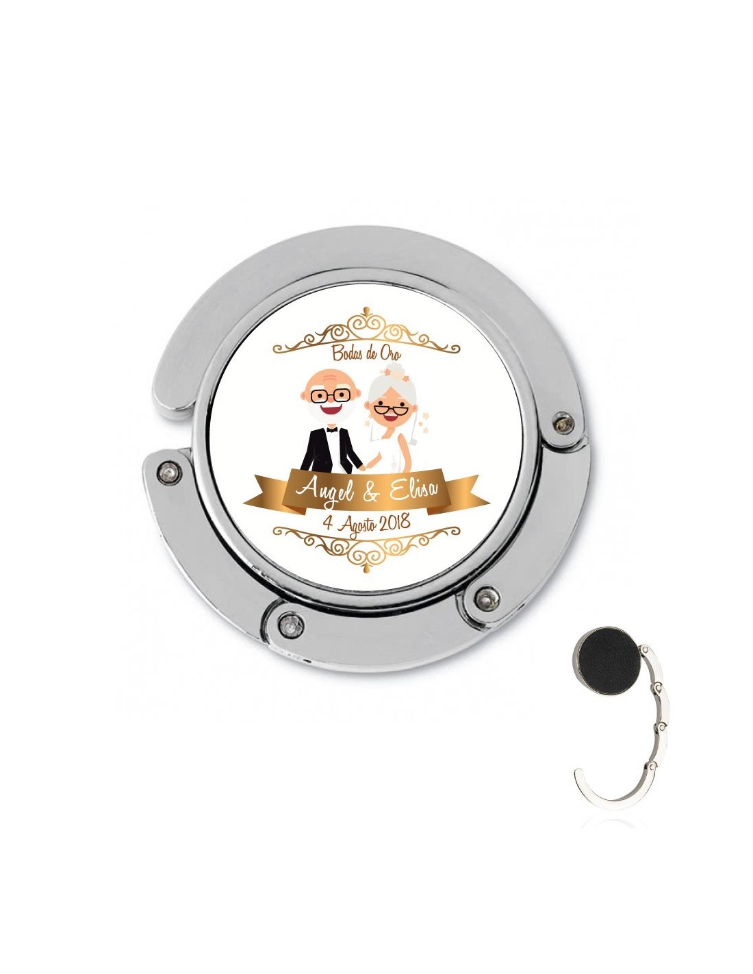 No olvide guardar su personalización para poder añadirla al carritoOriginal cuelgabolsos personalizado para bodas de oro decorado con unos simpáticos novios con canas.