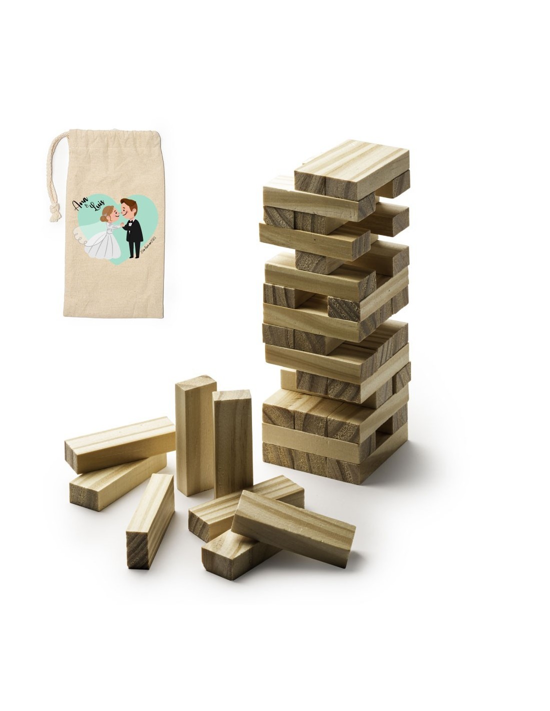 Este juego de habilidad formado por 45 bloques rectangulares e incluye una bolsa de algodón personalizable para guardarlo.