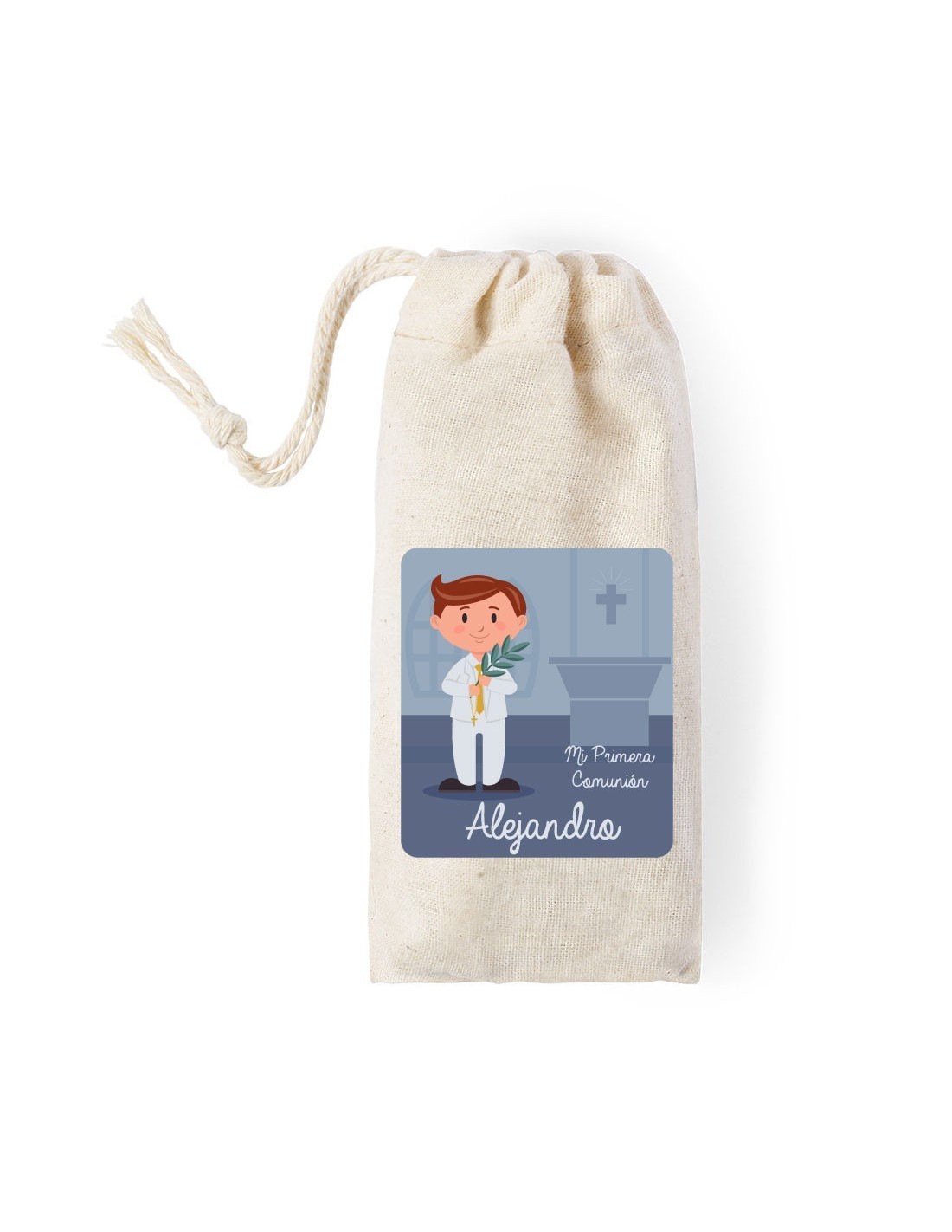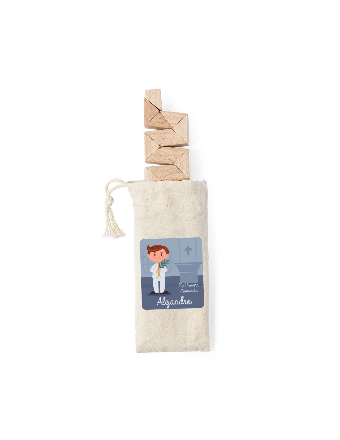 No olvide guardar su personalización para poder añadirla al carritoOriginal juego de habilidad con bolsa de algodón personalizada decorada con una simpático muñeco de comunión.