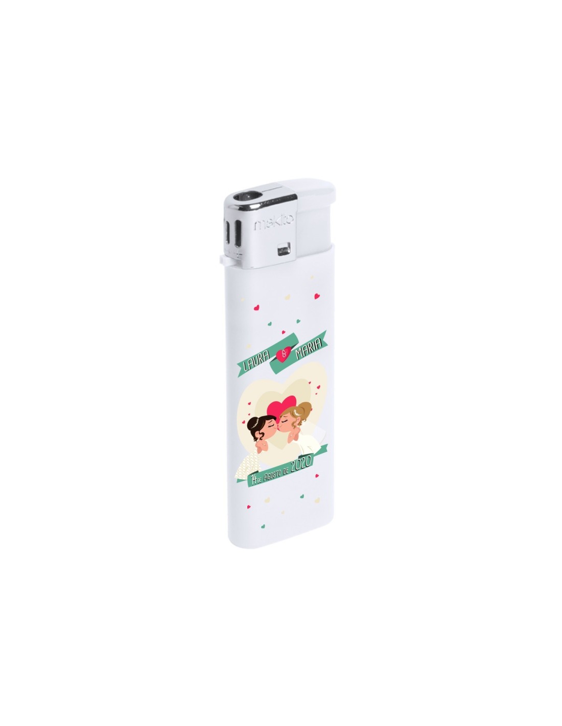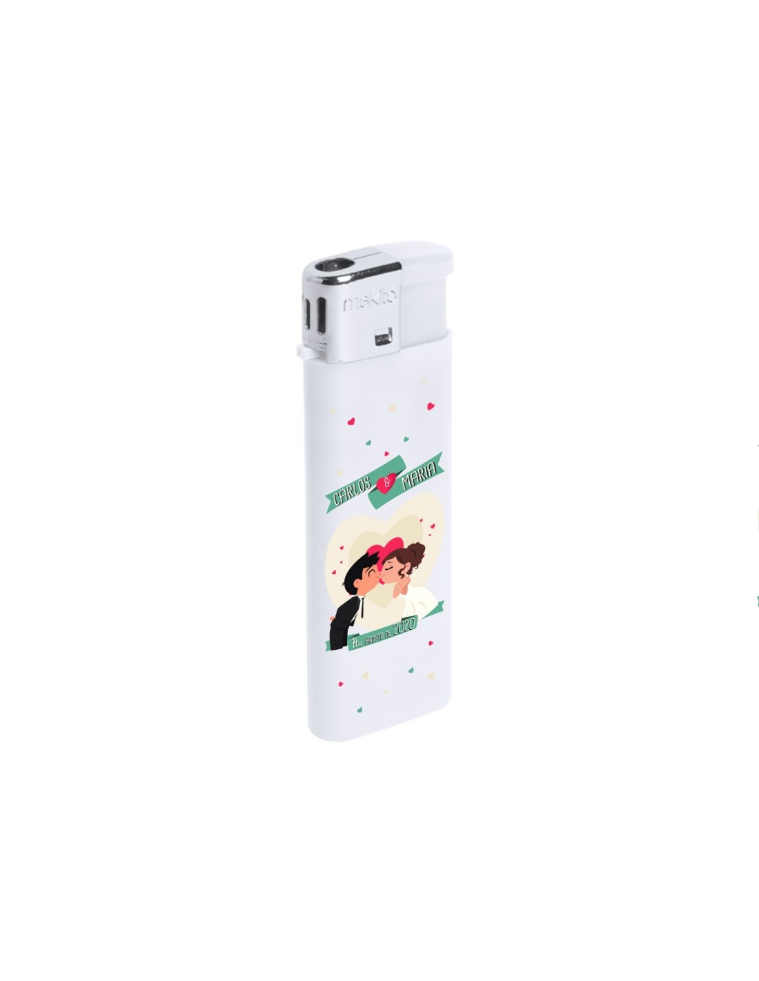 Original mechero personalizado para boda decorada con unos novios besándose.