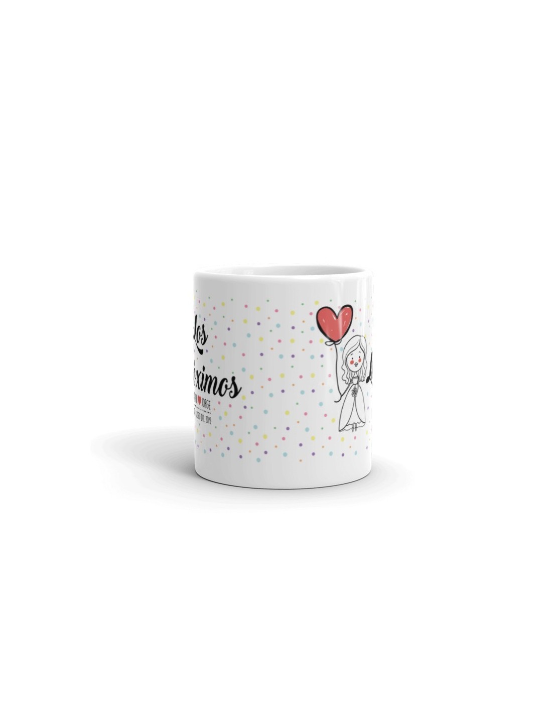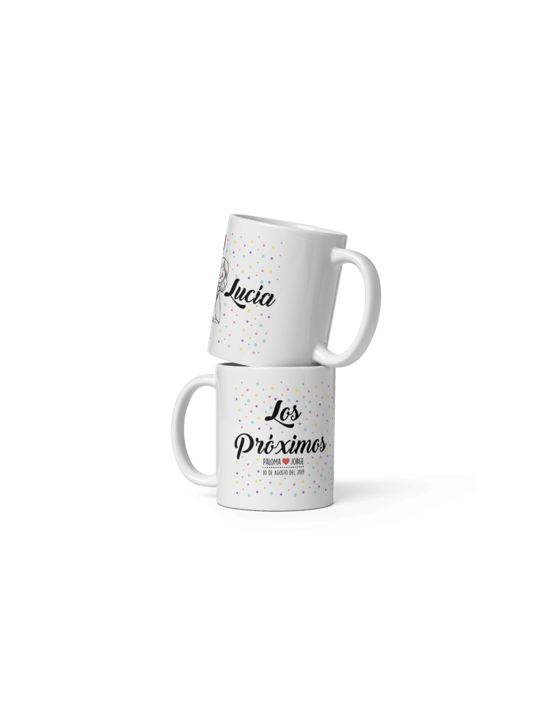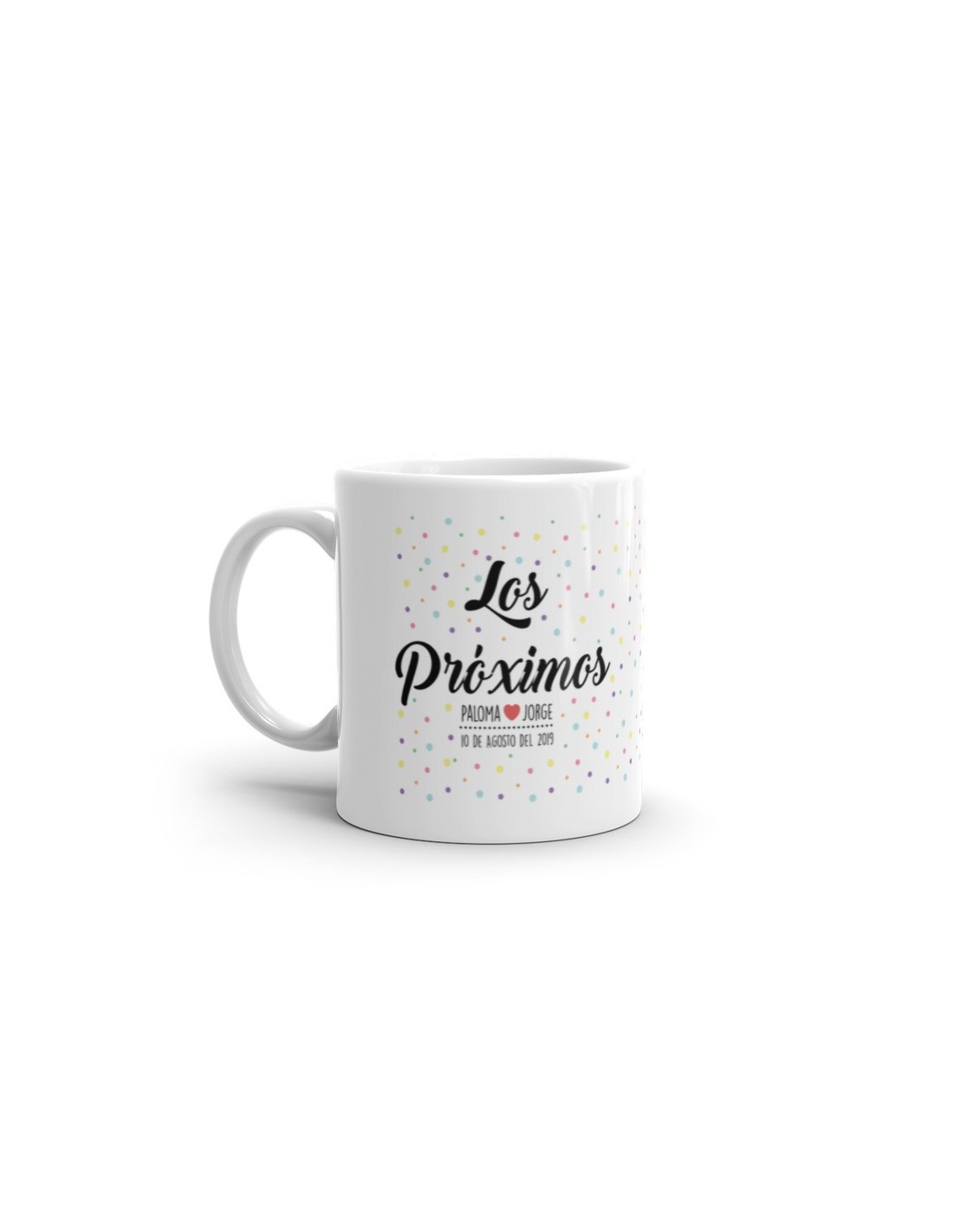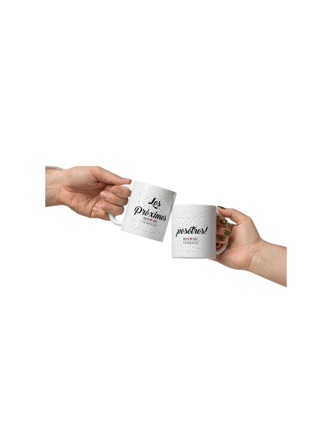 Pack compuesto por dos tazas personalizadas de porcelana blanca con asa decoradas con el mensaje "Los próximos ¡vosotros!".