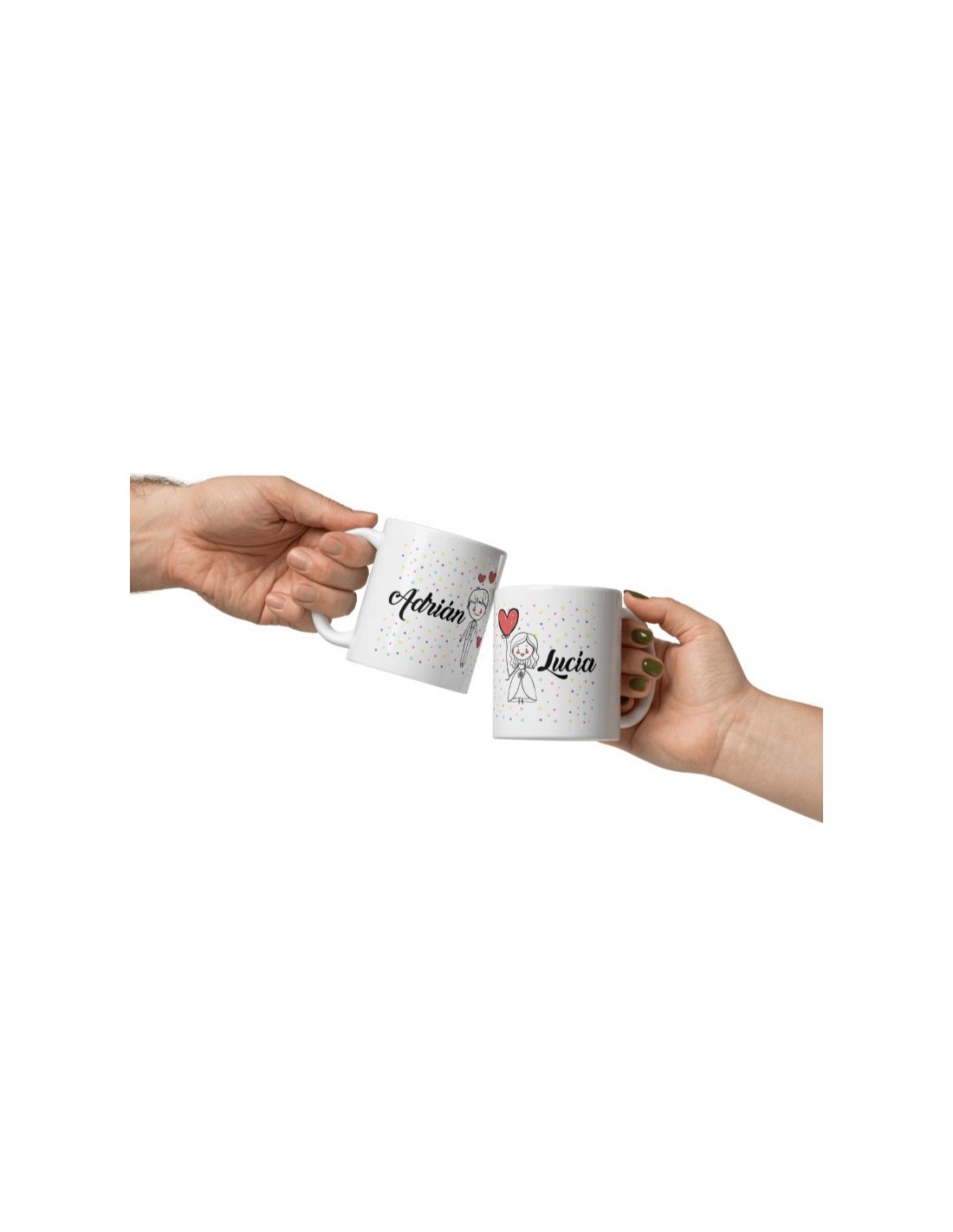 Ambas tazas son necesarias para poder leer el mensaje de forma conjunta. Además van personalizadas con los nombres de cada pareja, los nombres de los novios y la fecha del enlace.