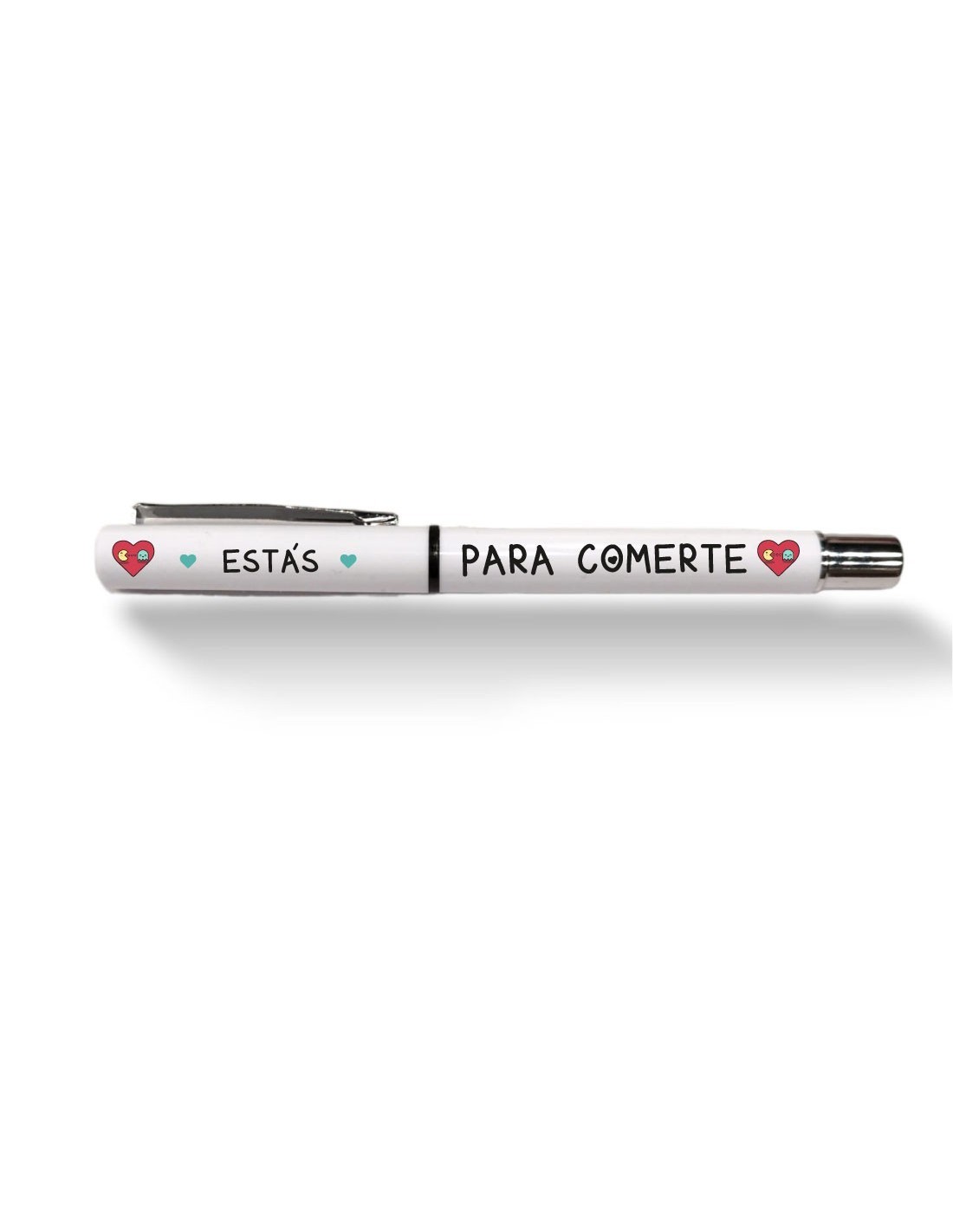 Original bolígrafo tipo roller de tinta azul decorado con el mensaje "el mundo es mejor contigo".