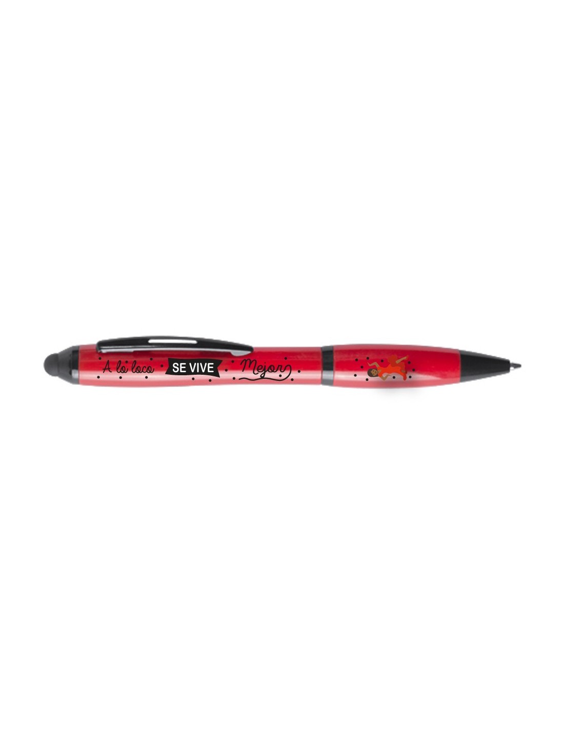 Original bolígrafo puntero rojo decorado con el mensaje "a lo loco se vive mejor".