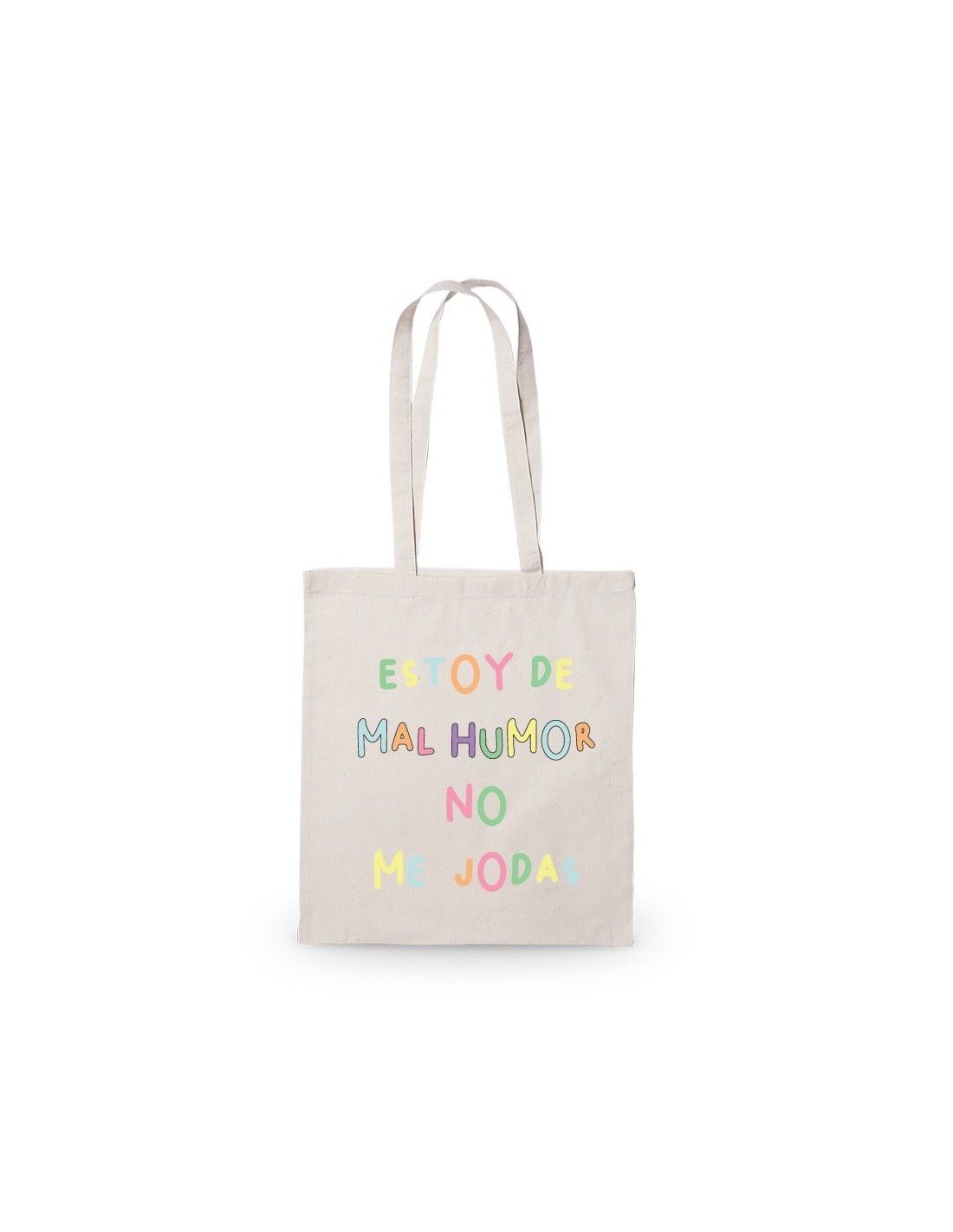 Amplia y ligera bolsa de algodón decorada con el mensaje "Estoy de mal humor, no me jodas".