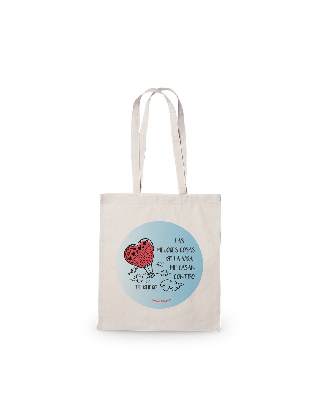 Amplia y ligera bolsa de algodón decorada con el mensaje "las mejores cosas de la vida me pasan contigo, te quiero".