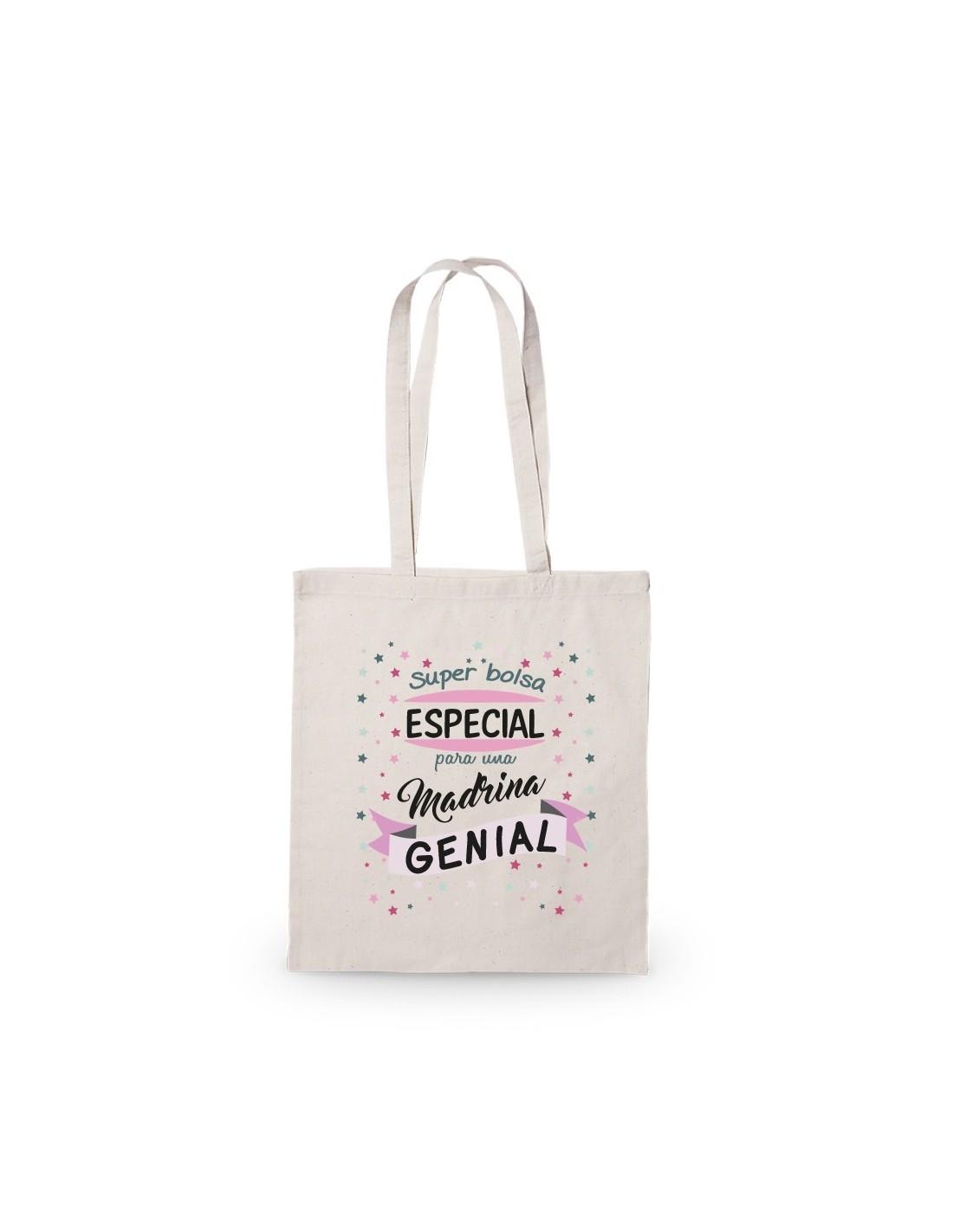 Amplia y ligera bolsa de algodón decorada con el mensaje "super bolsa especial para una madrina genial".