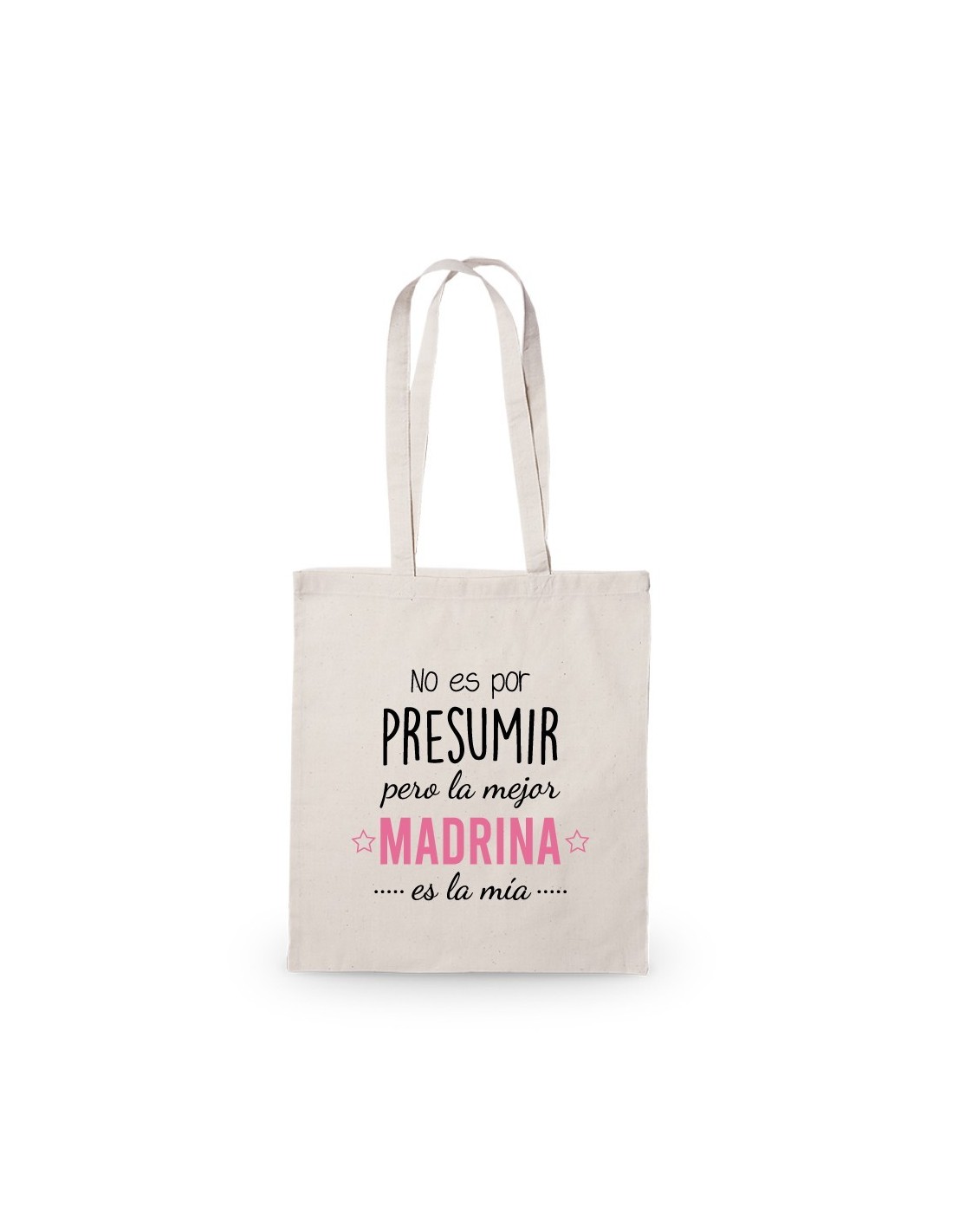 Amplia y ligera bolsa de algodón decorada con el mensaje "no es por presumir pero la mejor madrina es la mía".