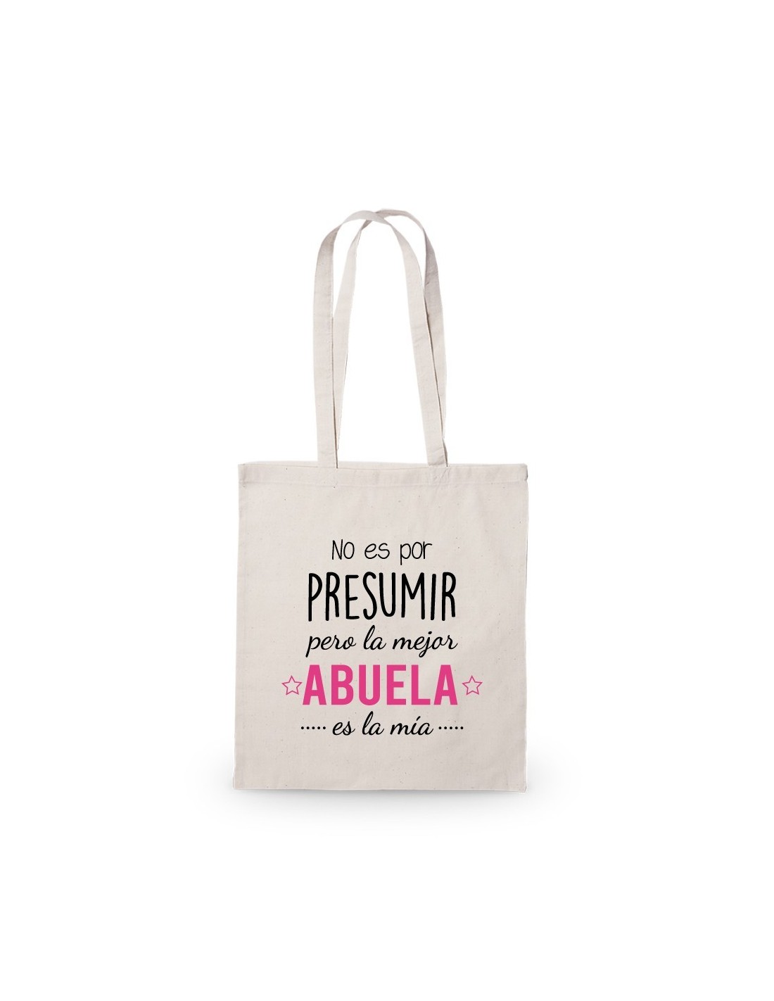 Amplia y ligera bolsa de algodón decorada con el mensaje "no es por presumir pero la mejor abuela es la mía".