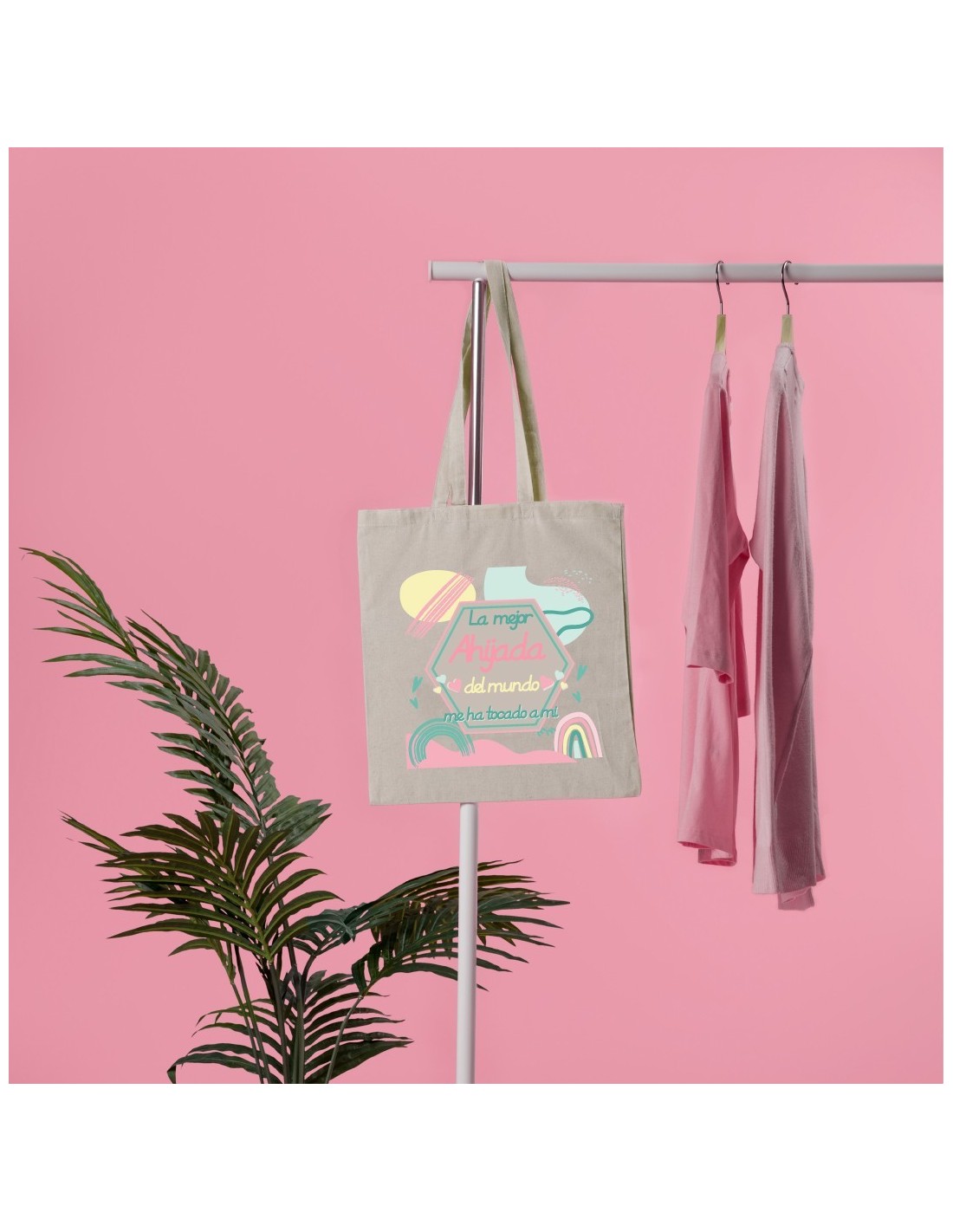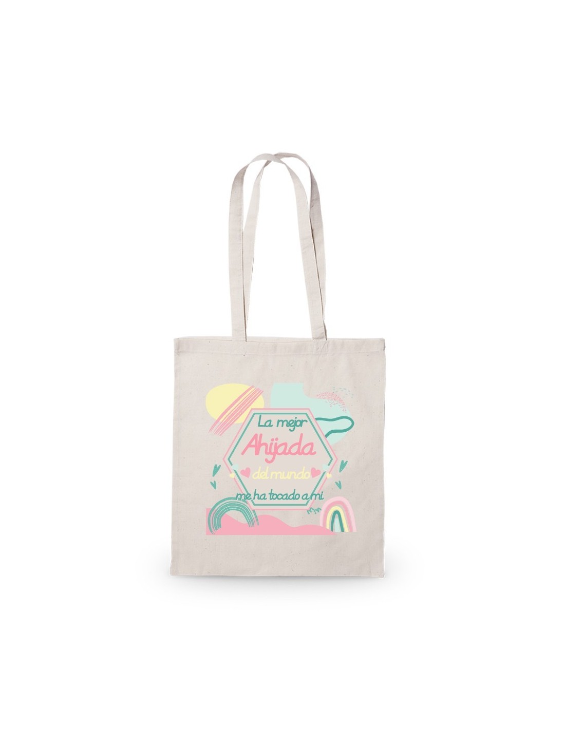 Amplia y ligera bolsa de algodón decorada con el mensaje "la mejor ahijada del mundo me ha tocado a mi".