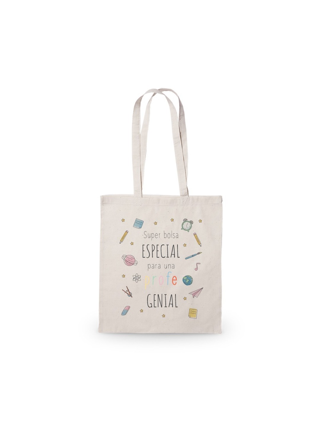 Amplia y ligera bolsa de algodón decorada con el texto "super bolsa especial para un/a profe genial"".