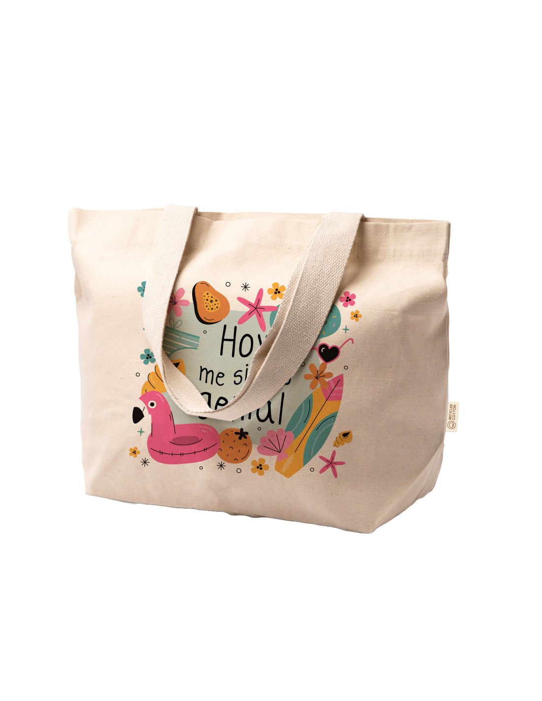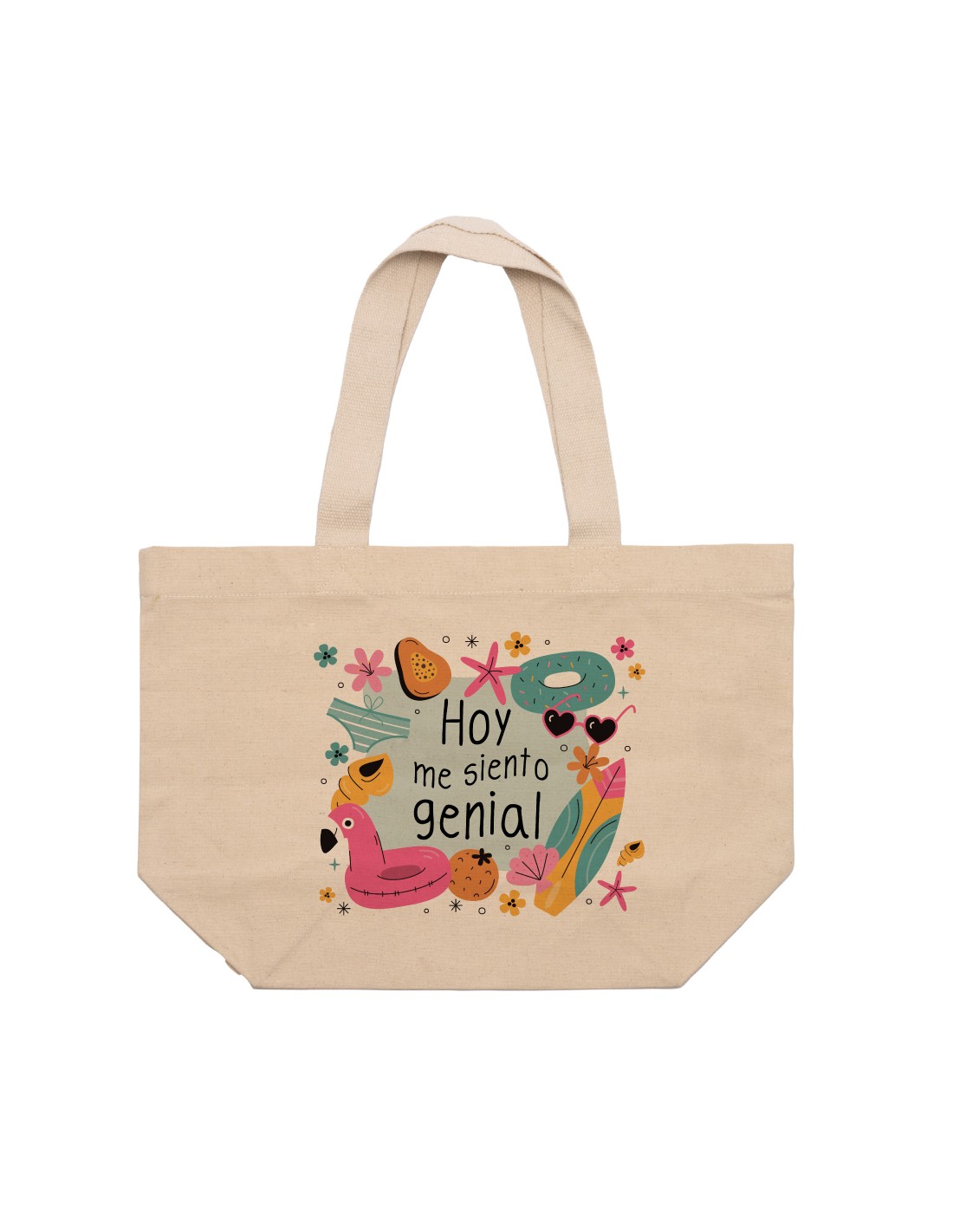 0Amplio y ligero capazo de algodón decorado con el mensaje "hoy me siento genial".