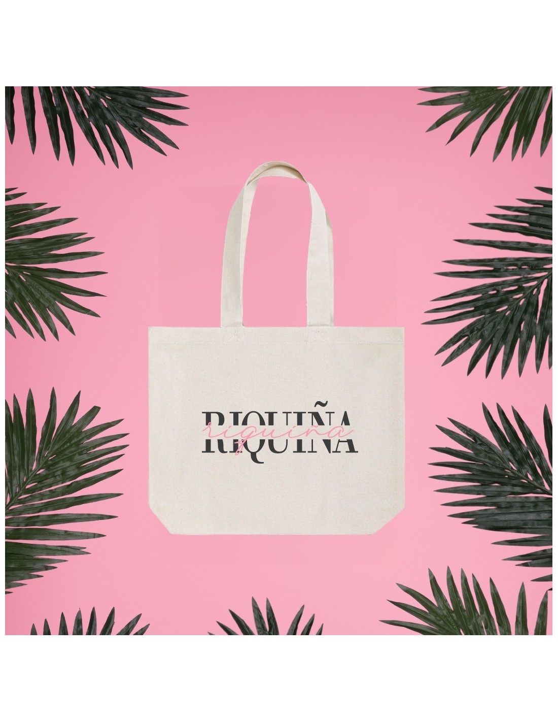 Amplio y ligero capazo de algodón decorado con el mensaje "riquiña".