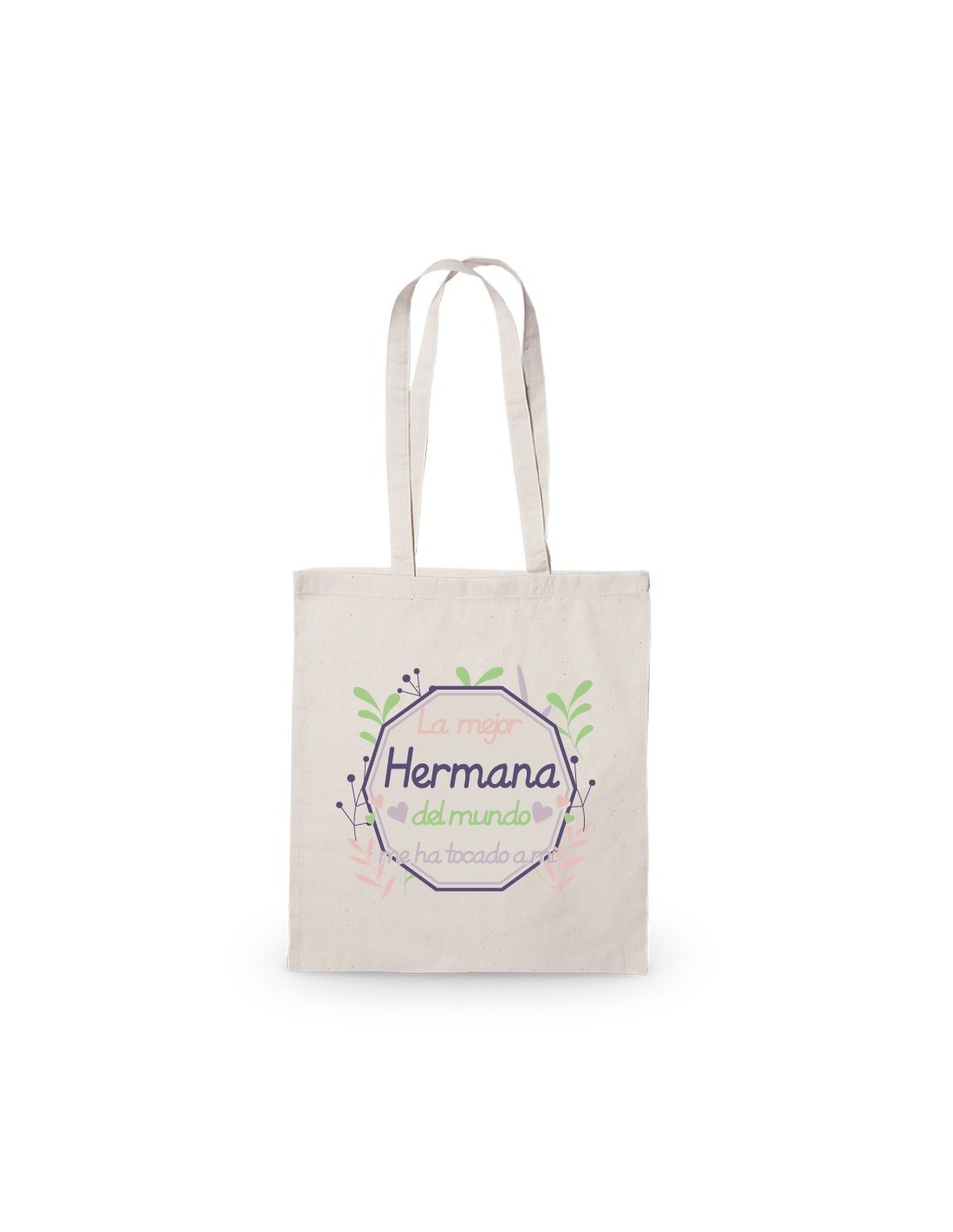 Amplia y ligera bolsa de algodón decorada con el mensaje "la mejor hermana del mundo me ha tocado a mi".