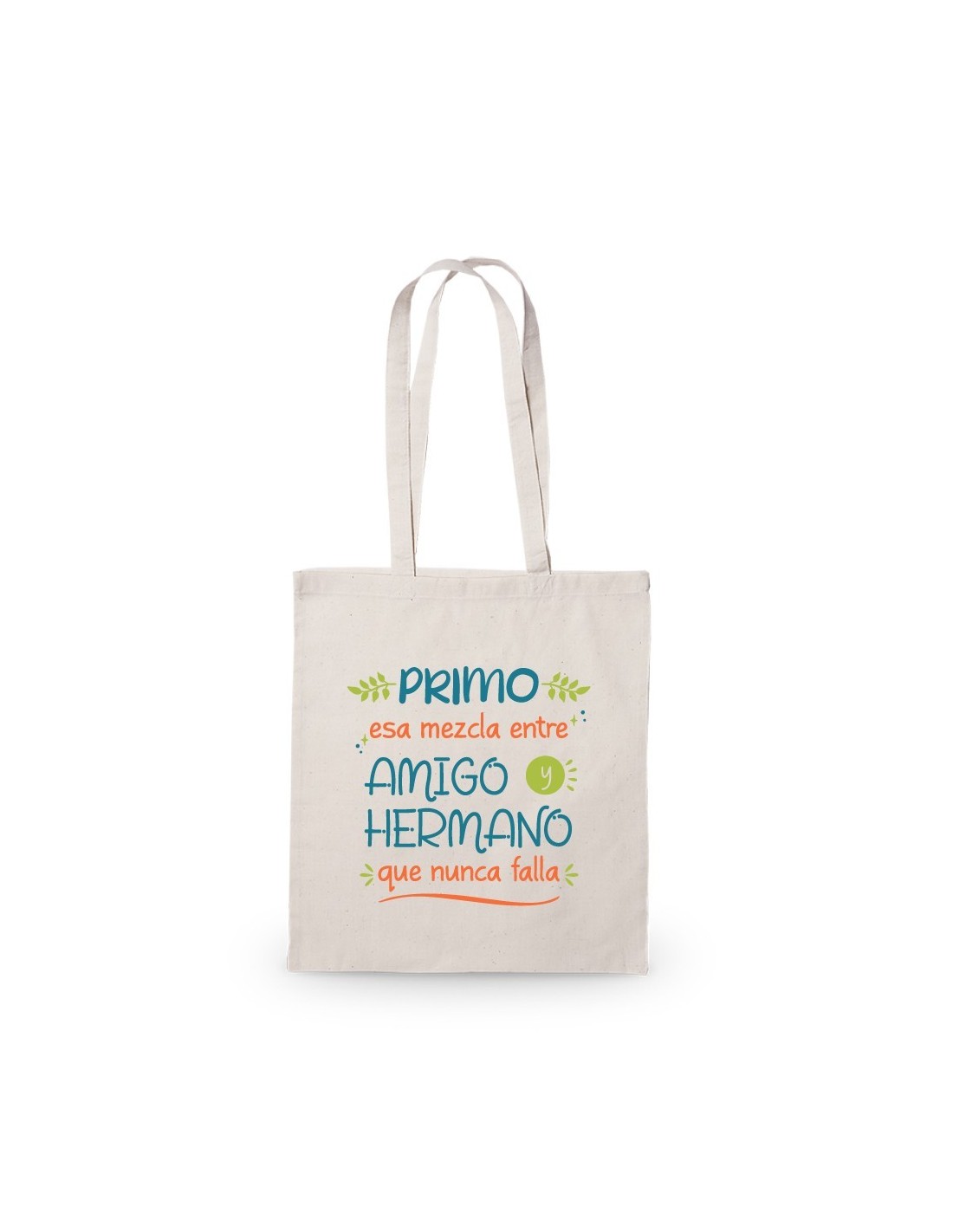 Amplia y ligera bolsa de algodón decorada con el mensaje "primo, esa mezcla entre amigo y hermano que nunca falla".