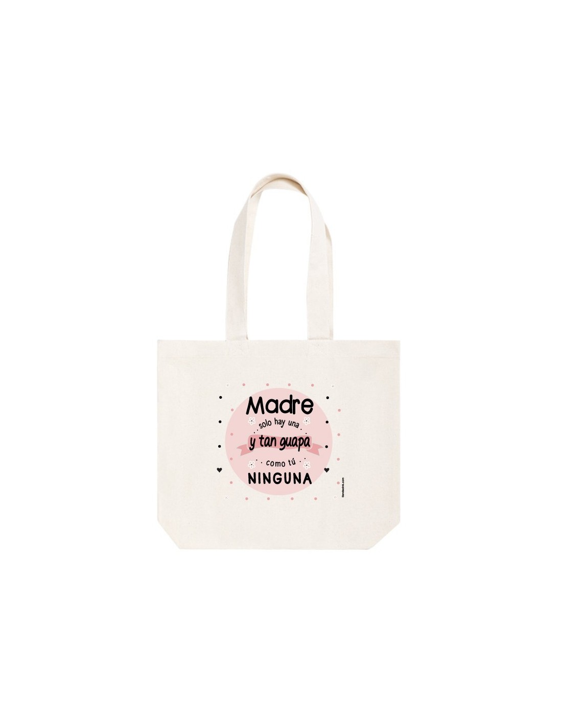 Amplio y ligero capazo de algodón decorado con el mensaje "madre solo hay una y tan guapa como tú ninguna".