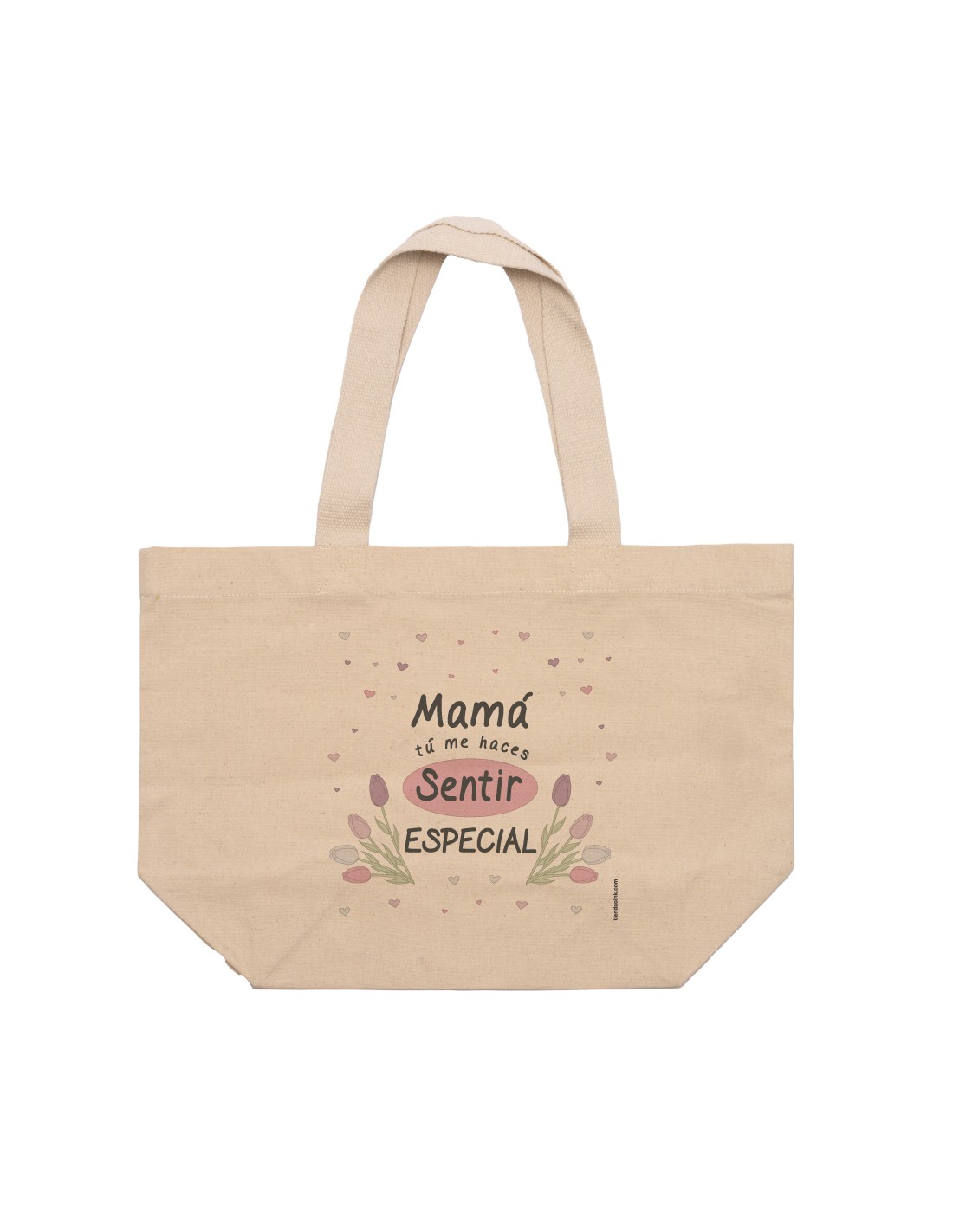 Amplio y ligero capazo de algodón decorado con el mensaje "mamá tú me haces sentir especial"".