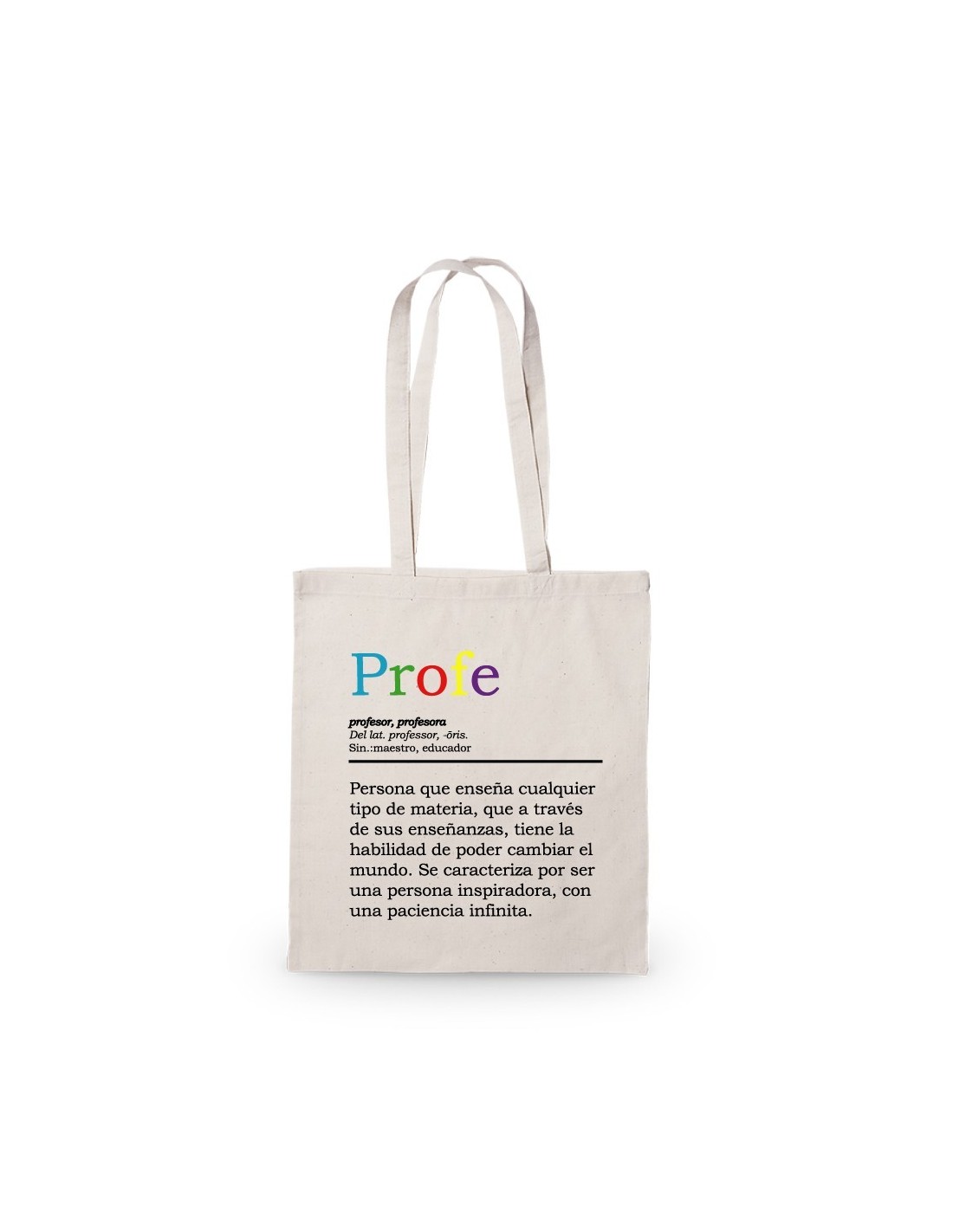 Amplia y ligera bolsa de algodón decorada con una cariñosa definición de profe.