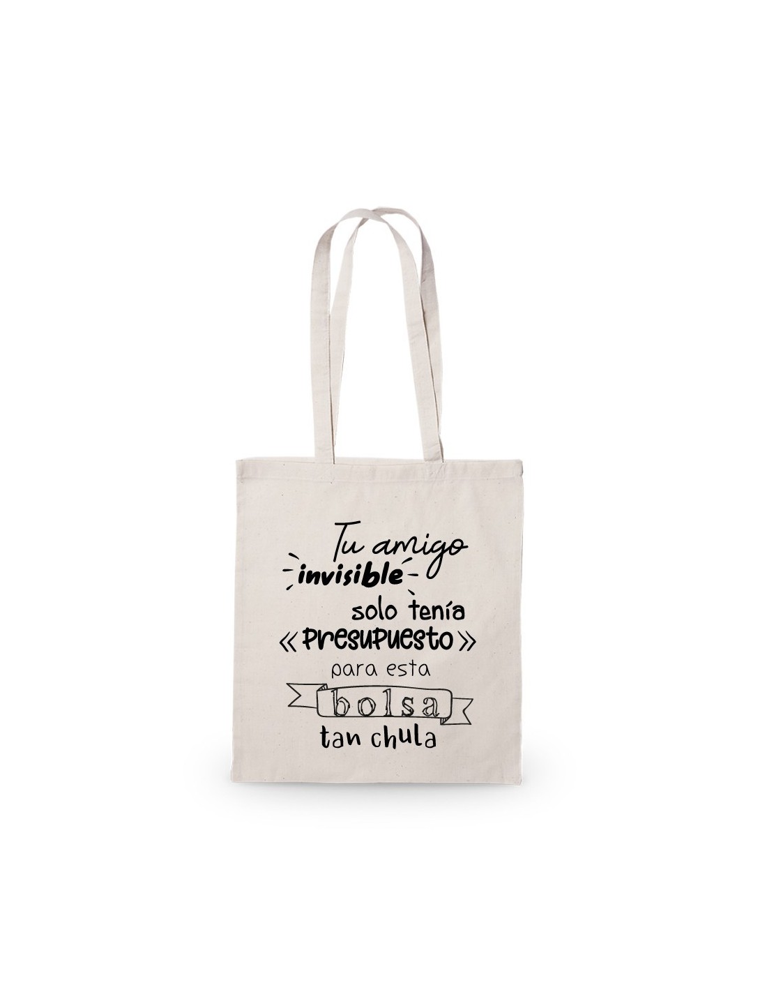 Amplia y ligera bolsa de algodón decorada con el mensaje "Tu amigo invisible solo tenía presupuesto para esta bolsa tan chula".