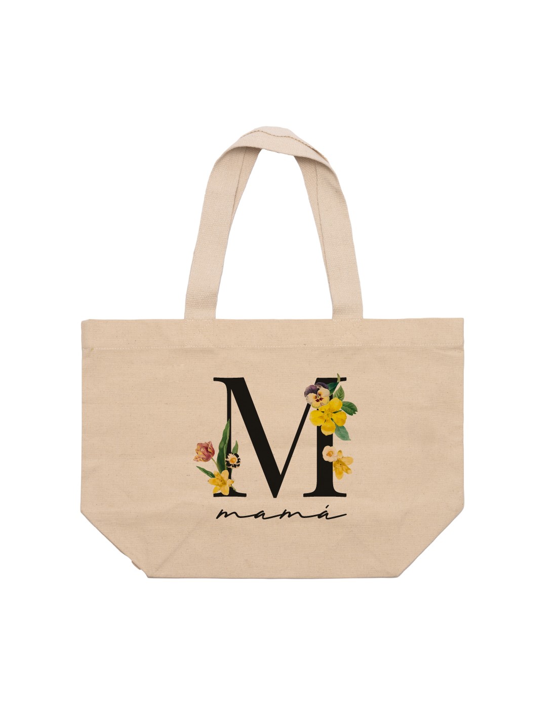 Amplio y ligero capazo de algodón decorado con la letra M y la palabra mamá.