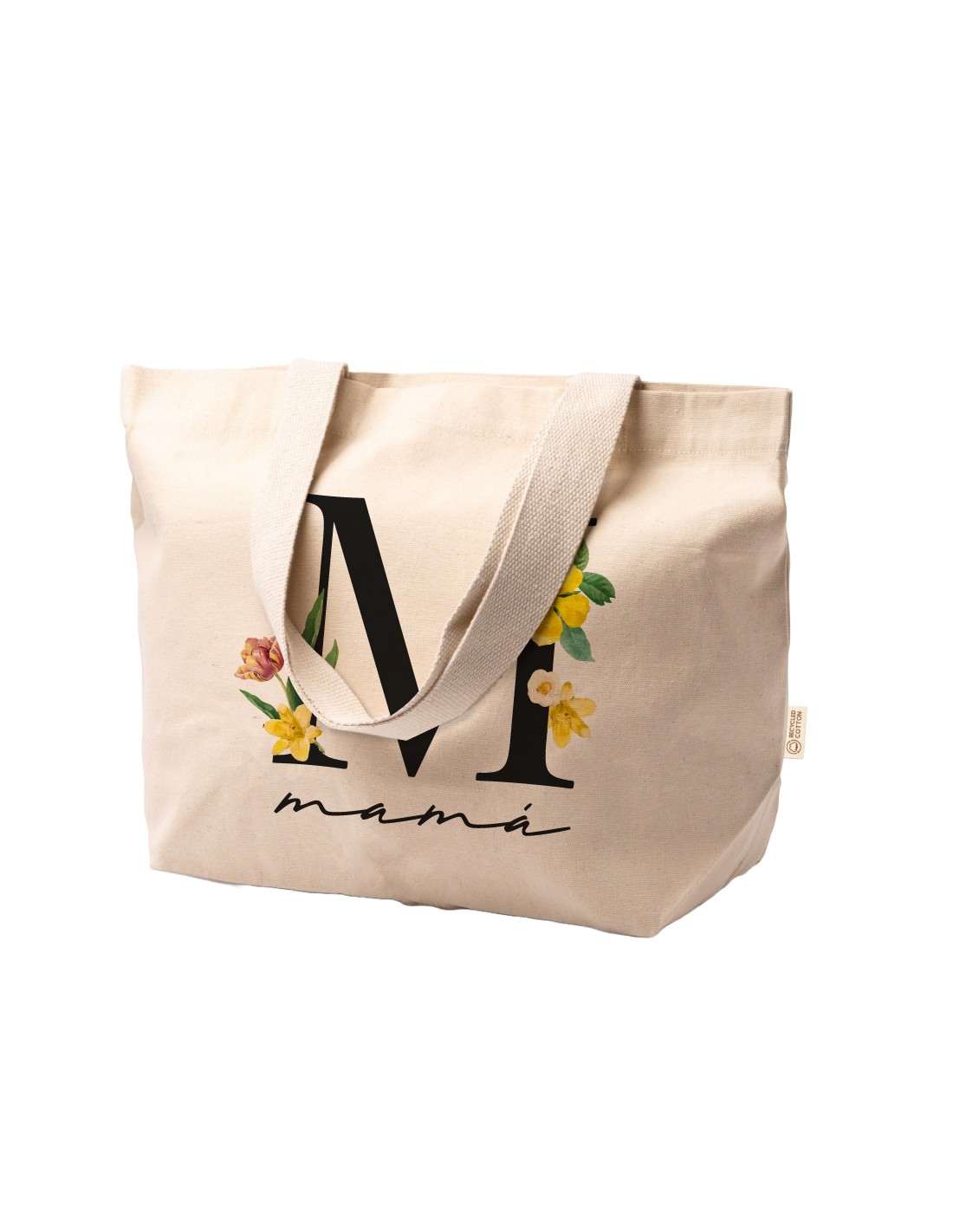 Amplio y ligero capazo de algodón decorado con la letra M y la palabra mamá.