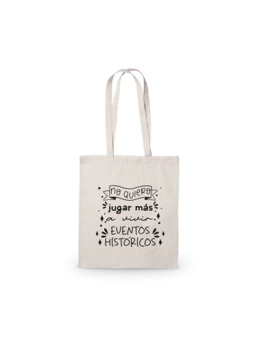 Amplia y ligera bolsa de algodón decorada con el mensaje "No quiero más a jugar a vivir eventos históricos".