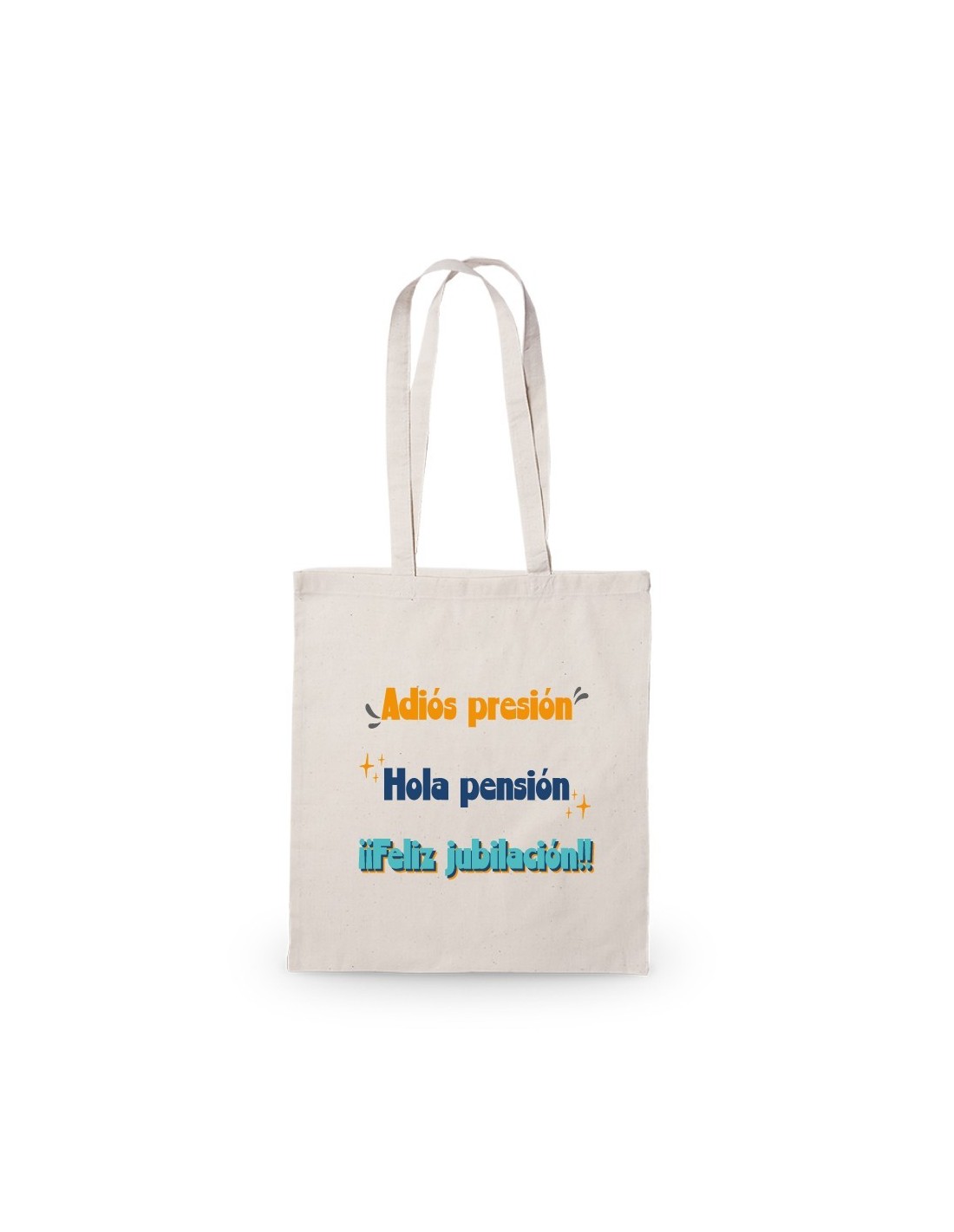 Amplia y ligera bolsa de algodón decorada con el mensaje "Adiós presión, hola pensión ¡¡feliz jubilación!!".