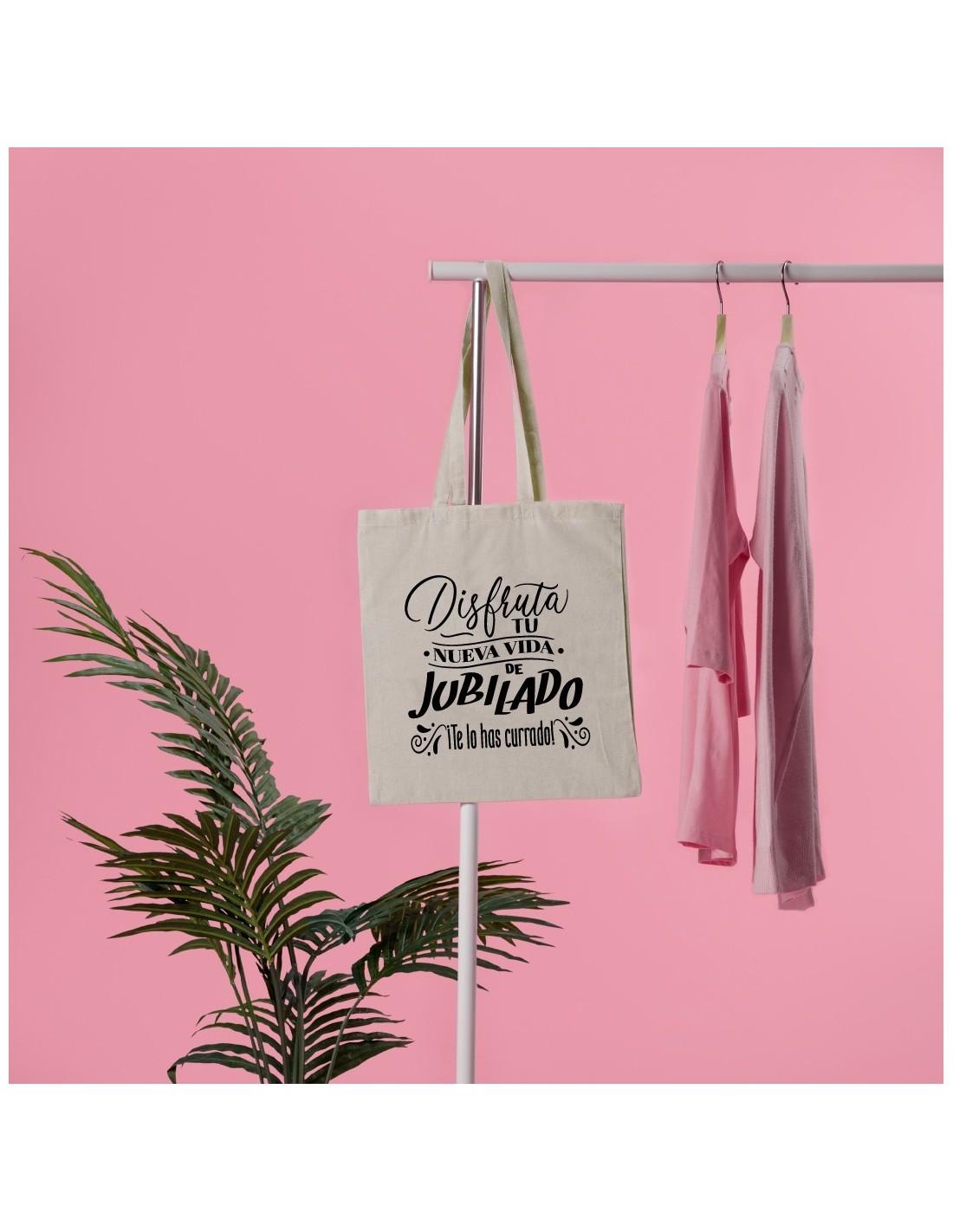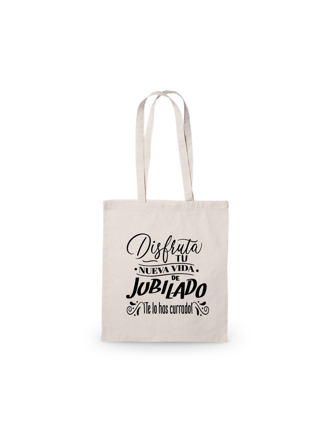 Amplia y ligera bolsa de algodón decorada con el mensaje "Disfruta tu nueva vida de jubilado ¡te lo has currado!".