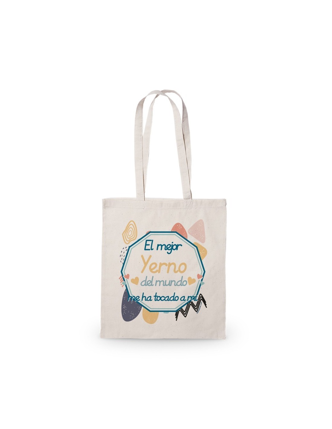 Amplia y ligera bolsa de algodón decorada con el mensaje "el mejor yerno del mundo me ha tocado a mi".