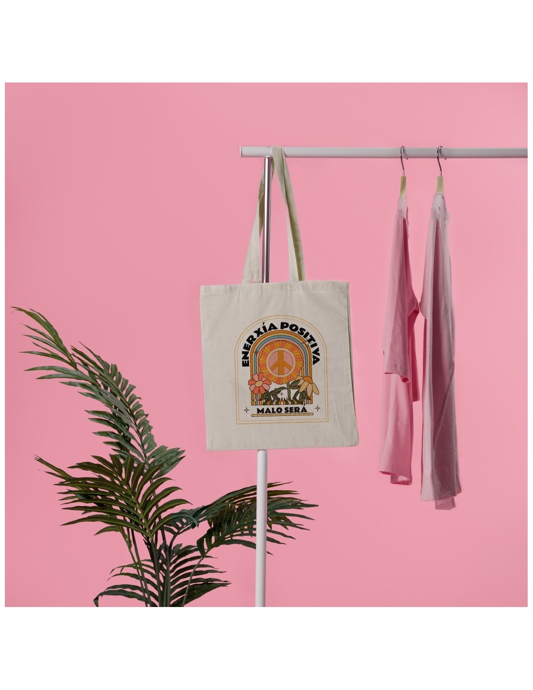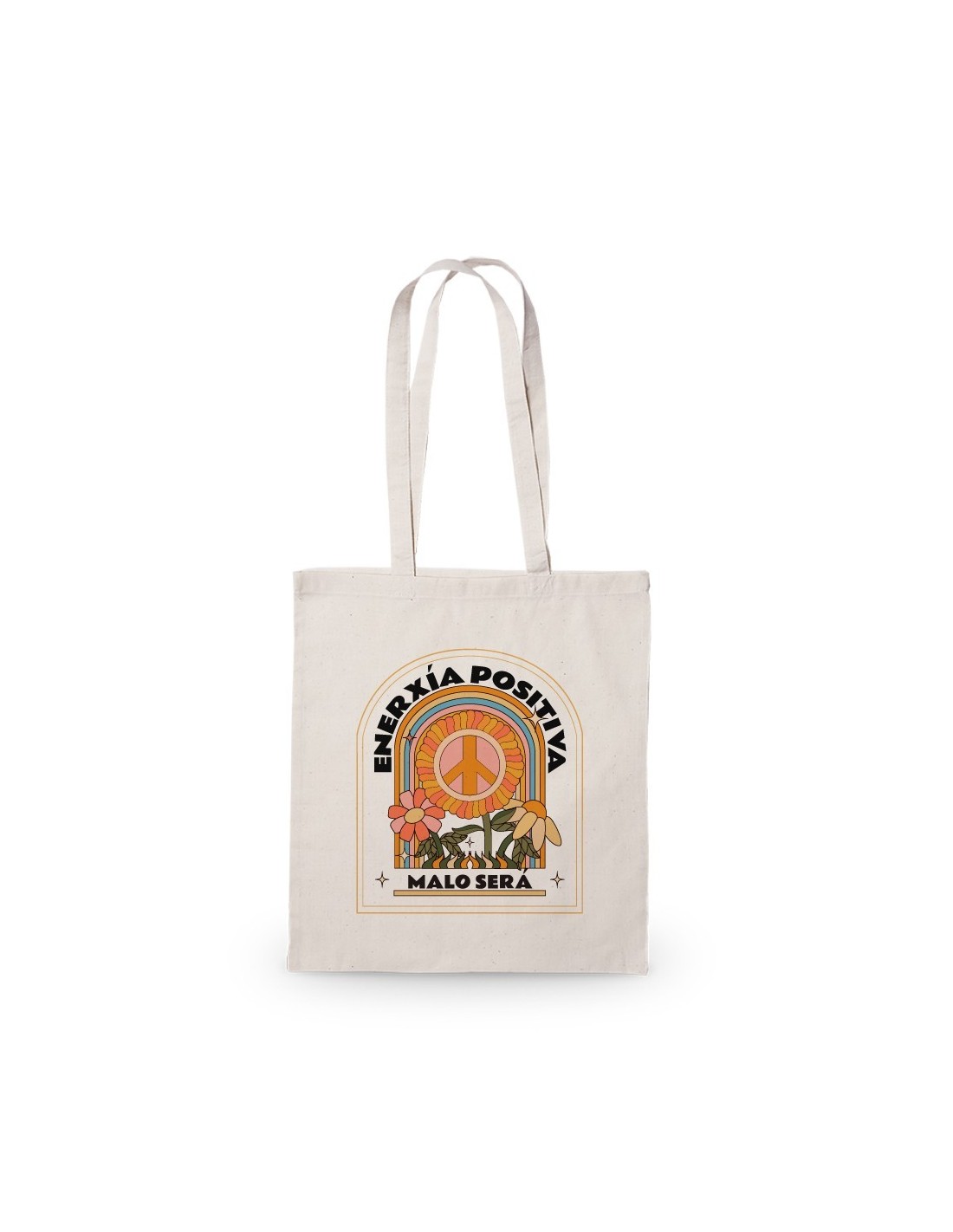 Amplia y ligera bolsa de algodón decorada con el mensaje "Enerxía positiva, malo será".