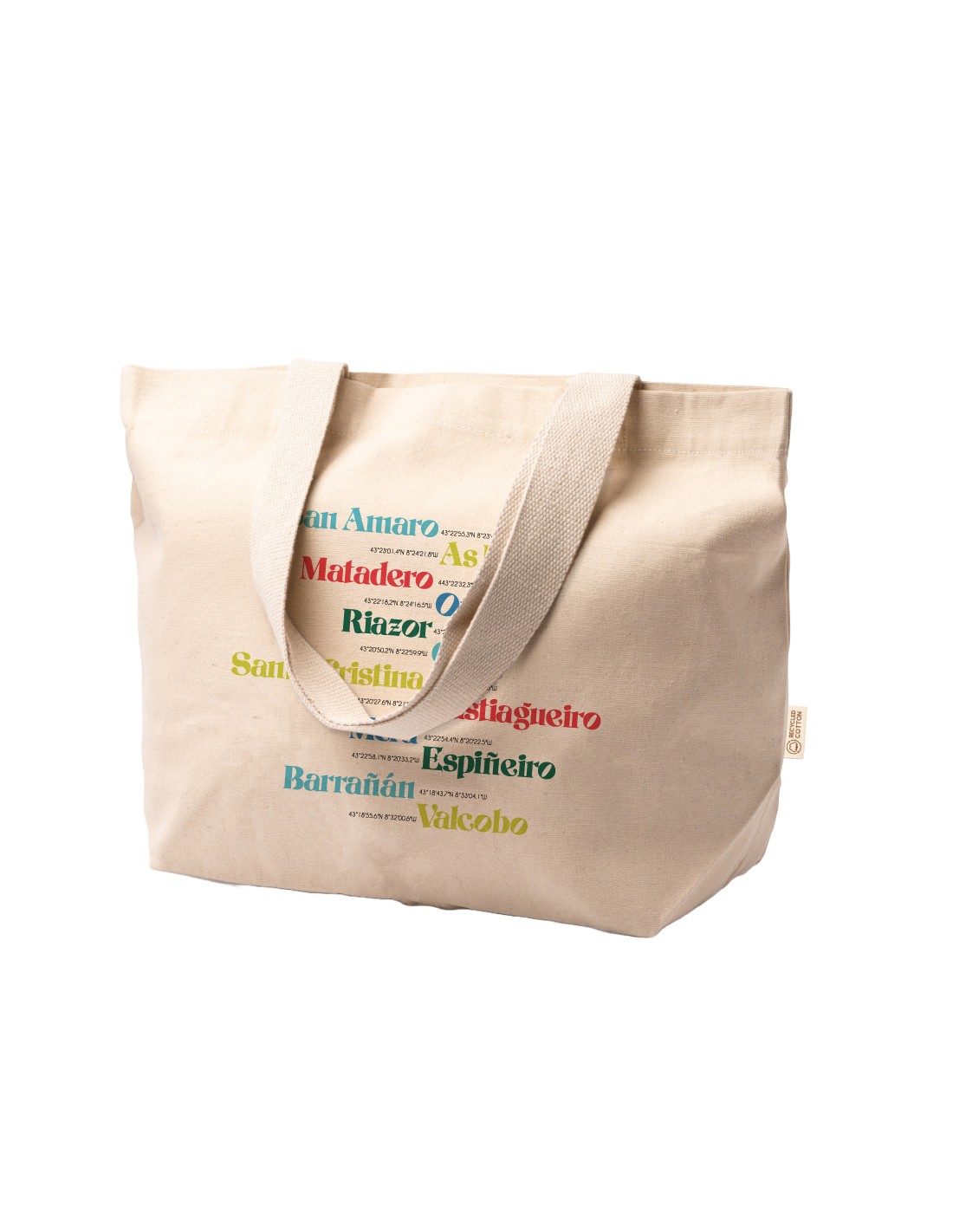 Amplio y ligero capazo de algodón decorado con las playas de A Coruña así como sus coordenadas para llegar.