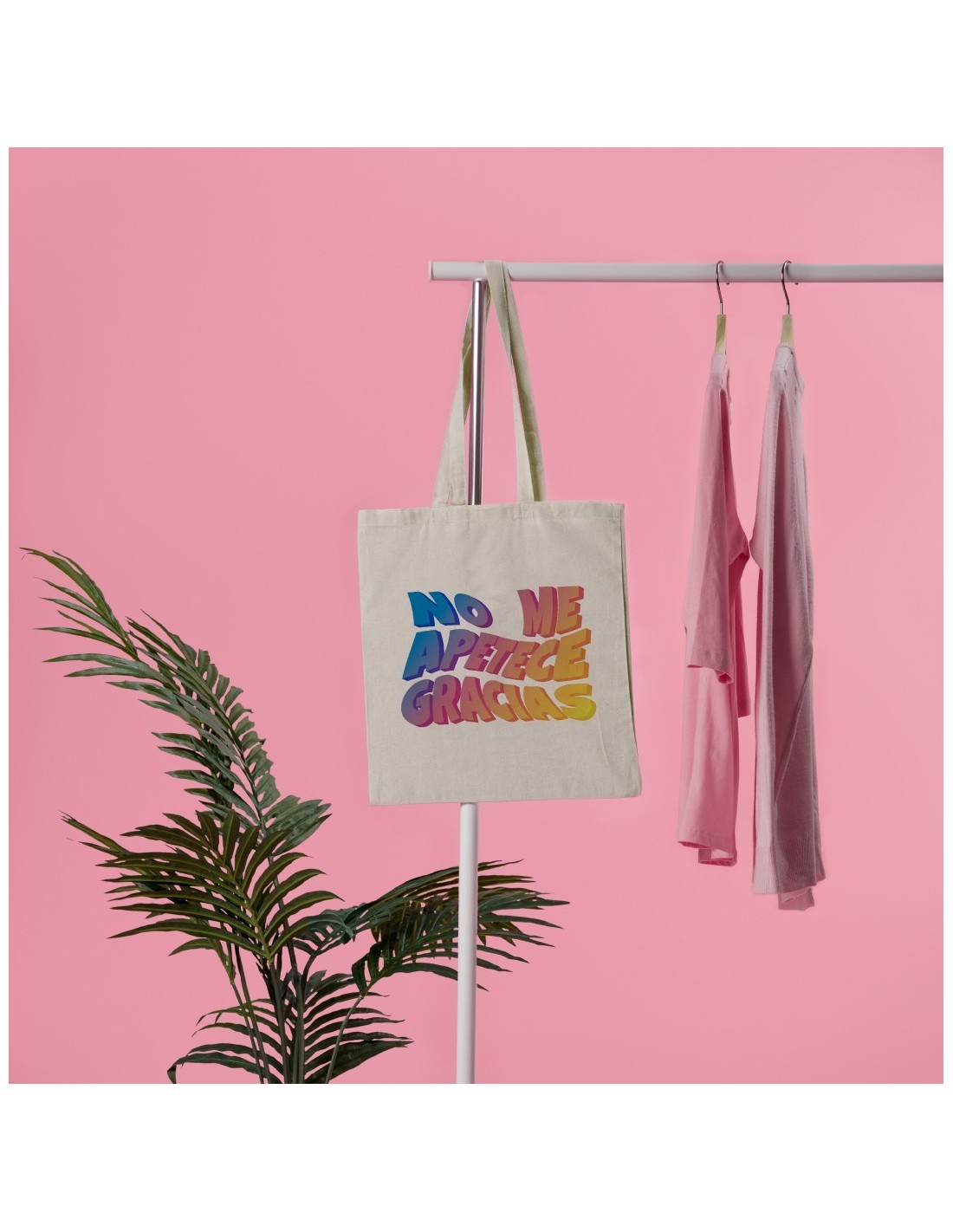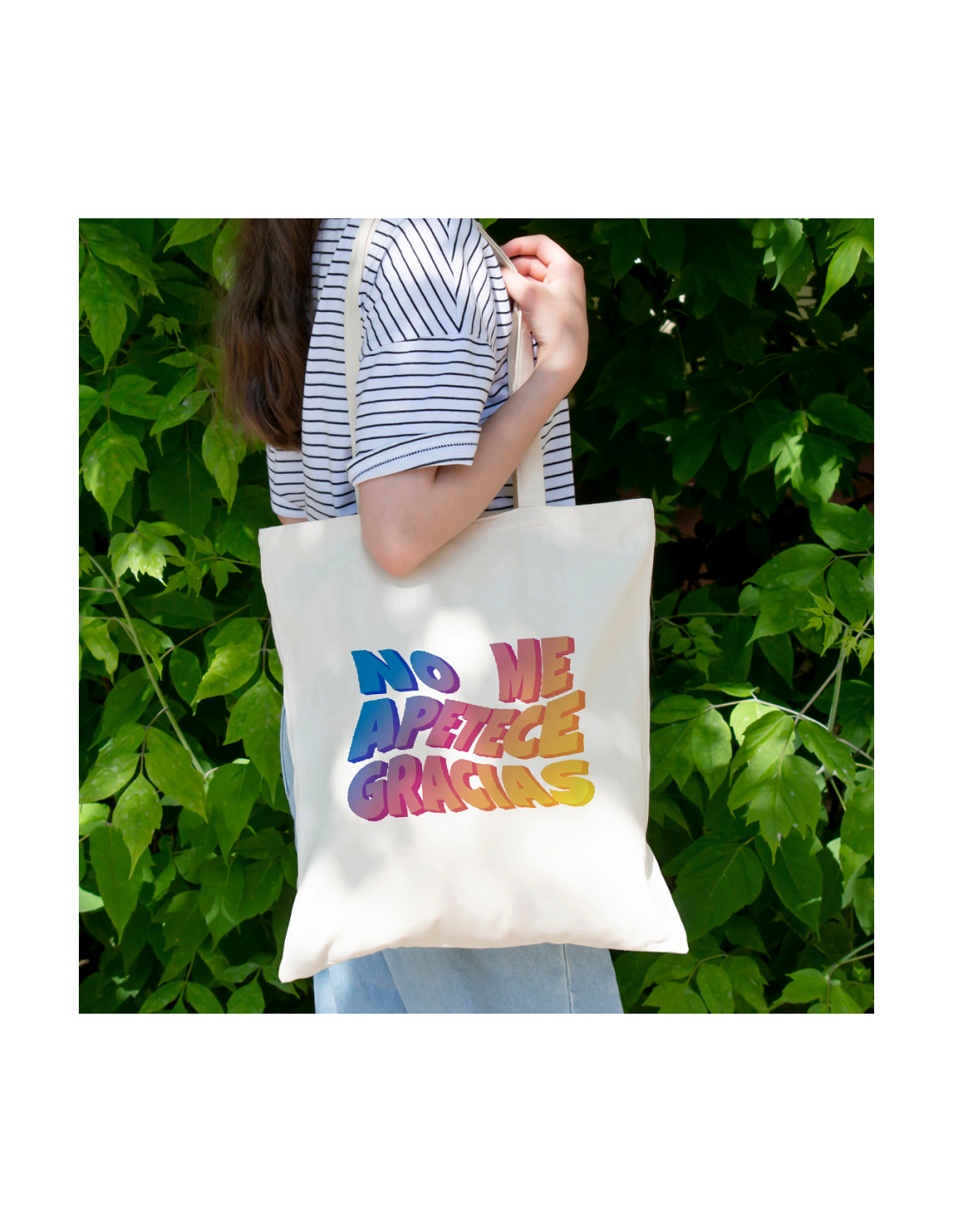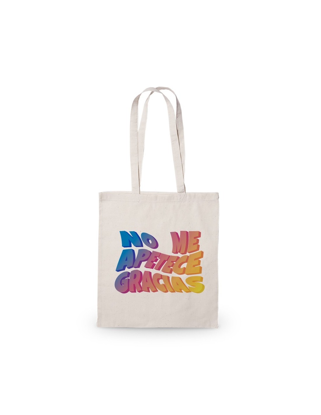 Amplia y ligera bolsa de algodón decorada con el mensaje "no me apetece gracias".