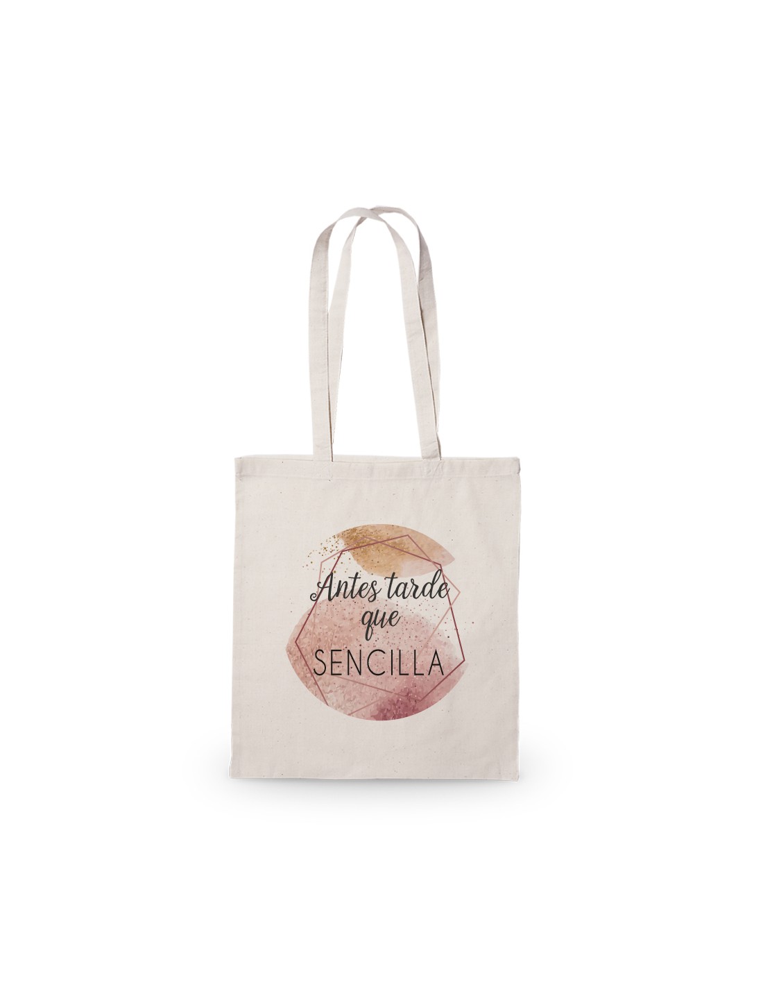 Amplia y ligera bolsa de algodón decorada con el mensaje "antes tarde que sencilla".