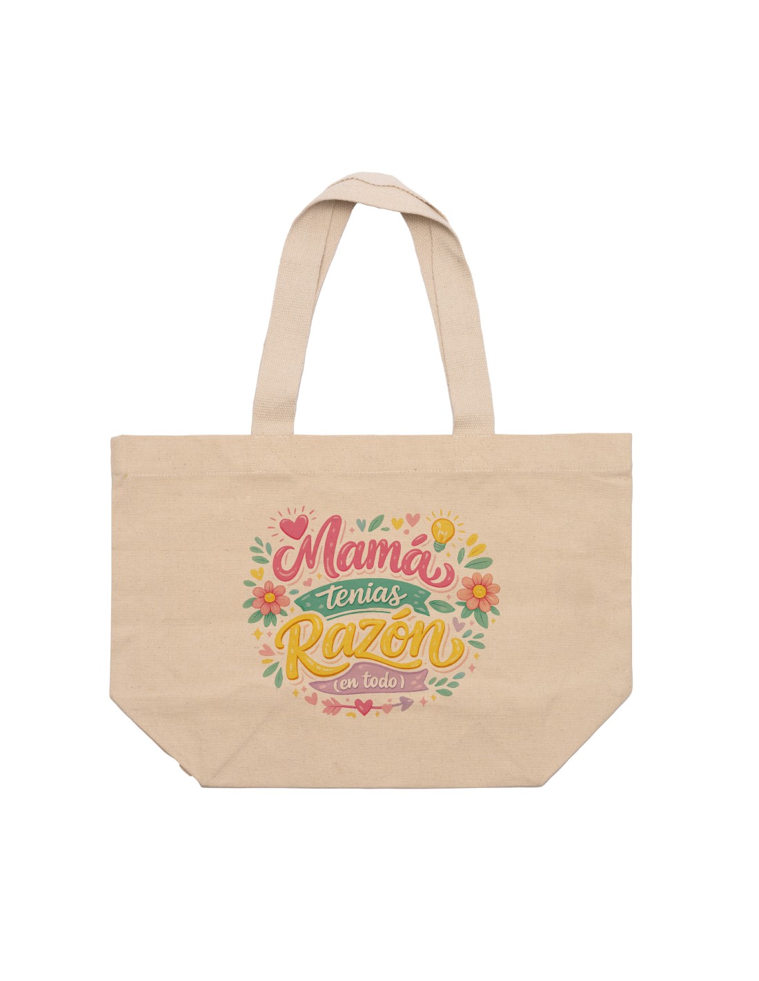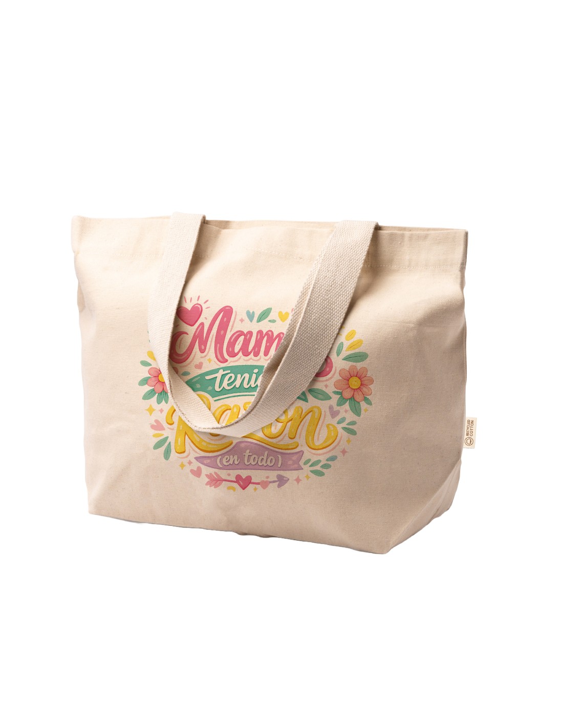 Amplio y ligero capazo de algodón decorado con el mensaje "Mamá tenías razón (en todo)".