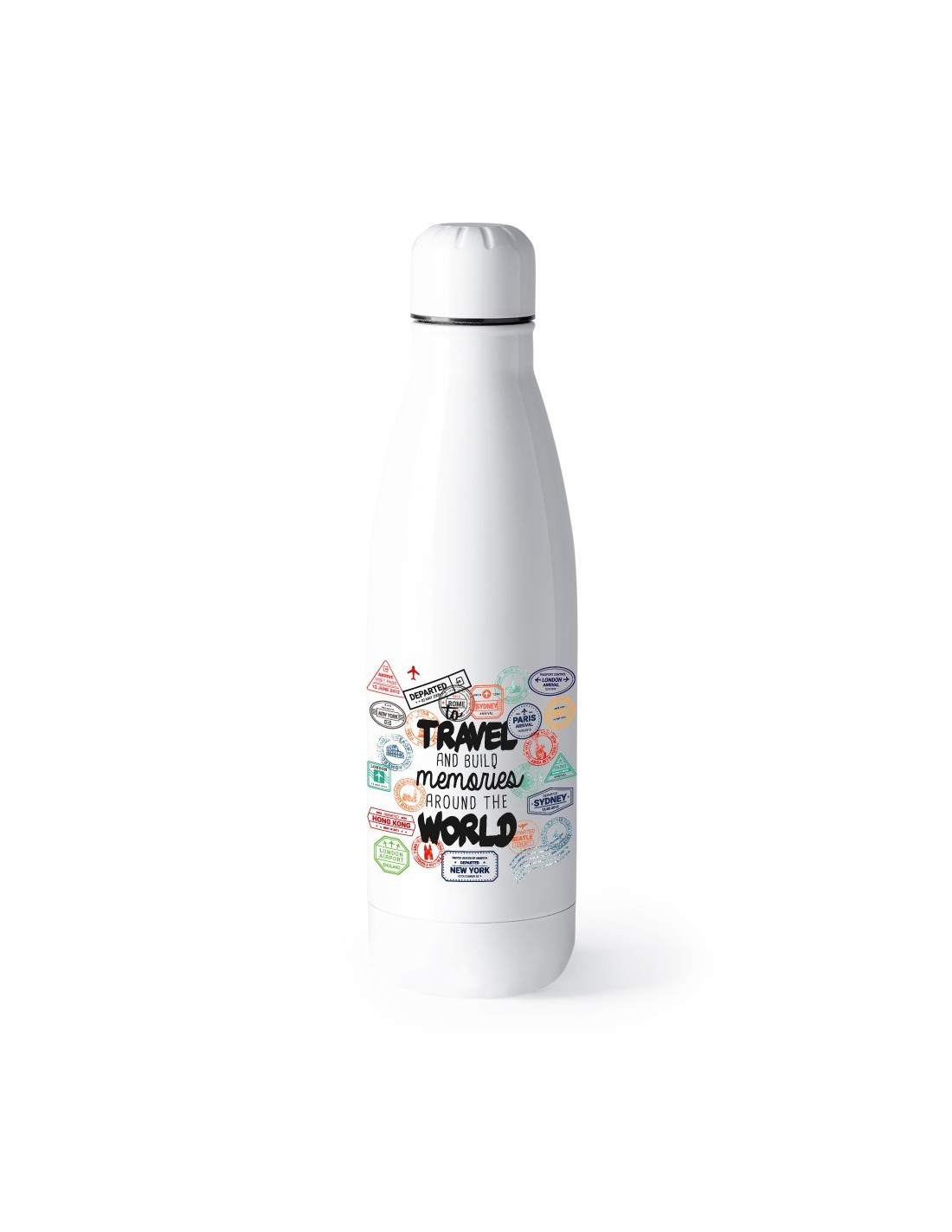Original y práctico bidón termo con doble pared decorado con el mensaje  "to travel to build memories around the world".