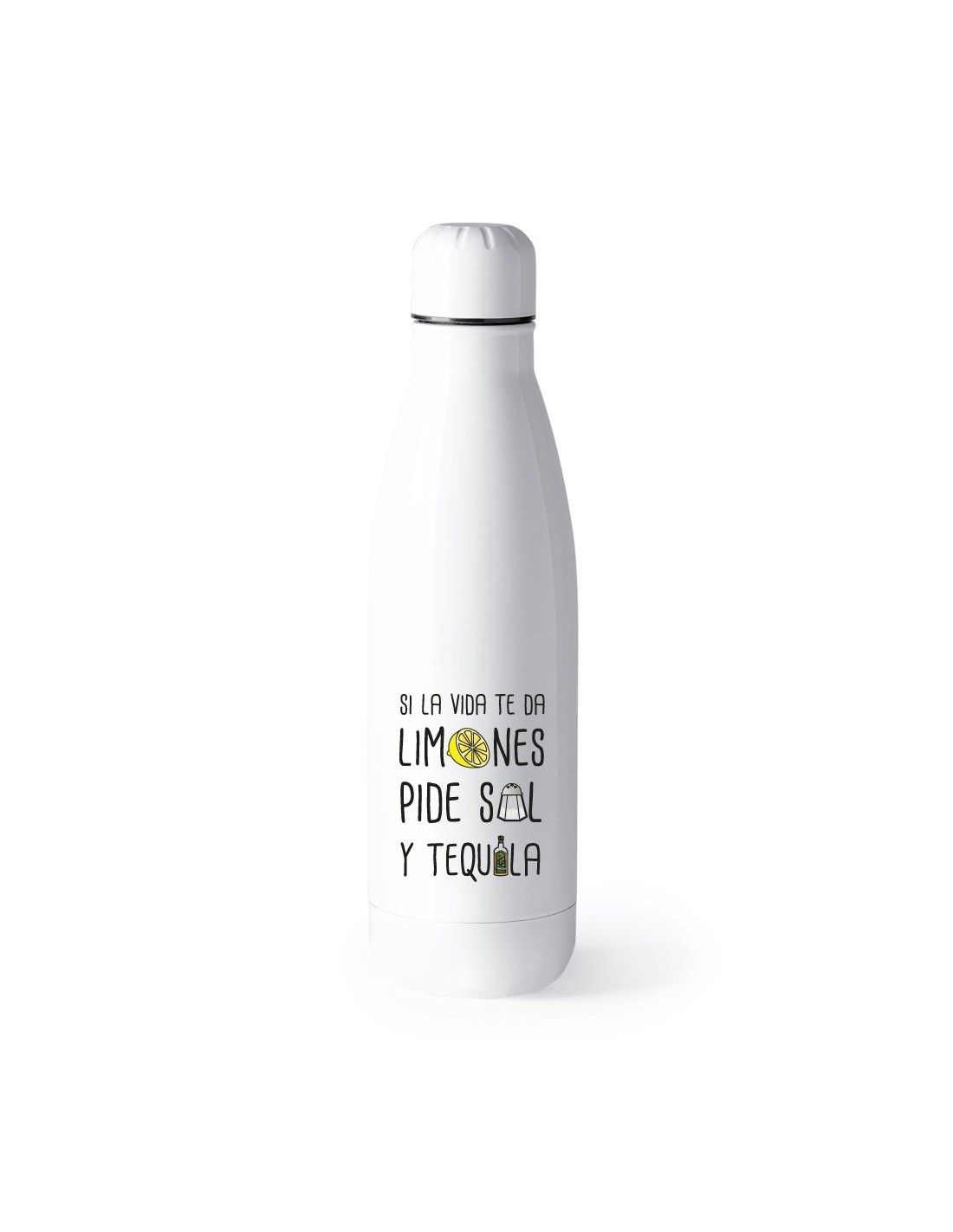 Original y práctico bidón termo con doble pared decorado con el mensaje "Si la vida te da limones pide sal y tequila".