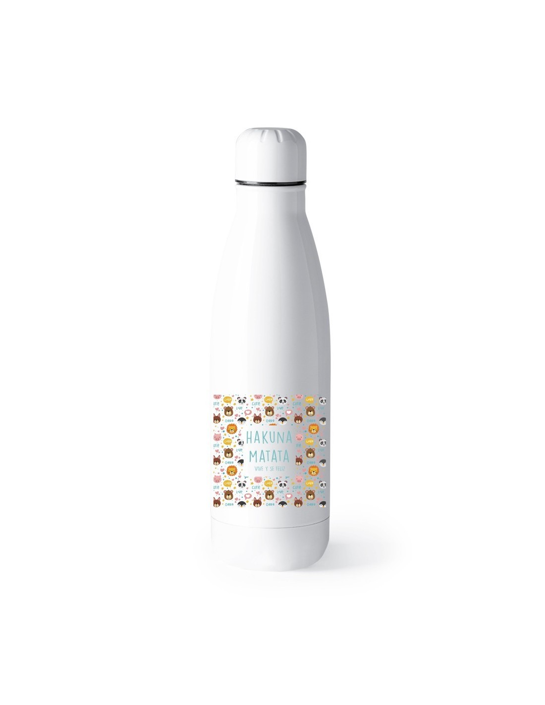 Original y práctico bidón termo con doble pared decorado con el mensaje "hakuna matata vive y se feliz".