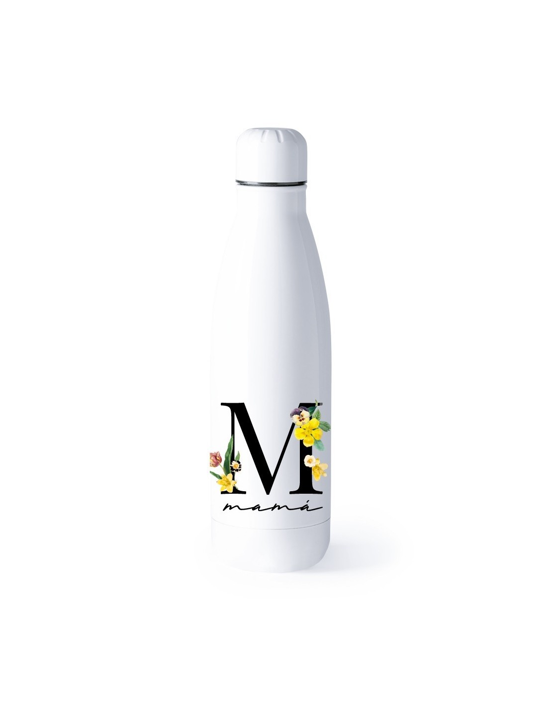 Original y práctico bidón termo con doble pared decorado con la letra M y la palabra mamá.